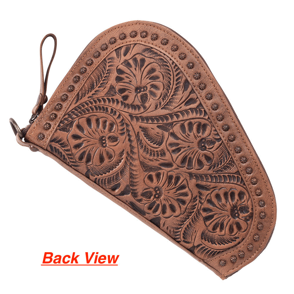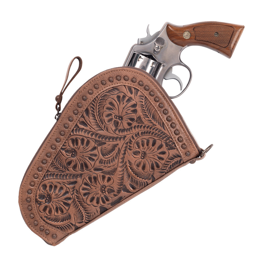 Padded gun case with zipper closure. Hand tooled, vegetable tanned, and hand stained genuine leather is tooled on the full exterior. Antiqued copper spots decorate the border of each side of the case. Interior has padded lining to protect the firearm and keep it secure. Designed to fit guns up to 5.5" overall height and 8" overall length.