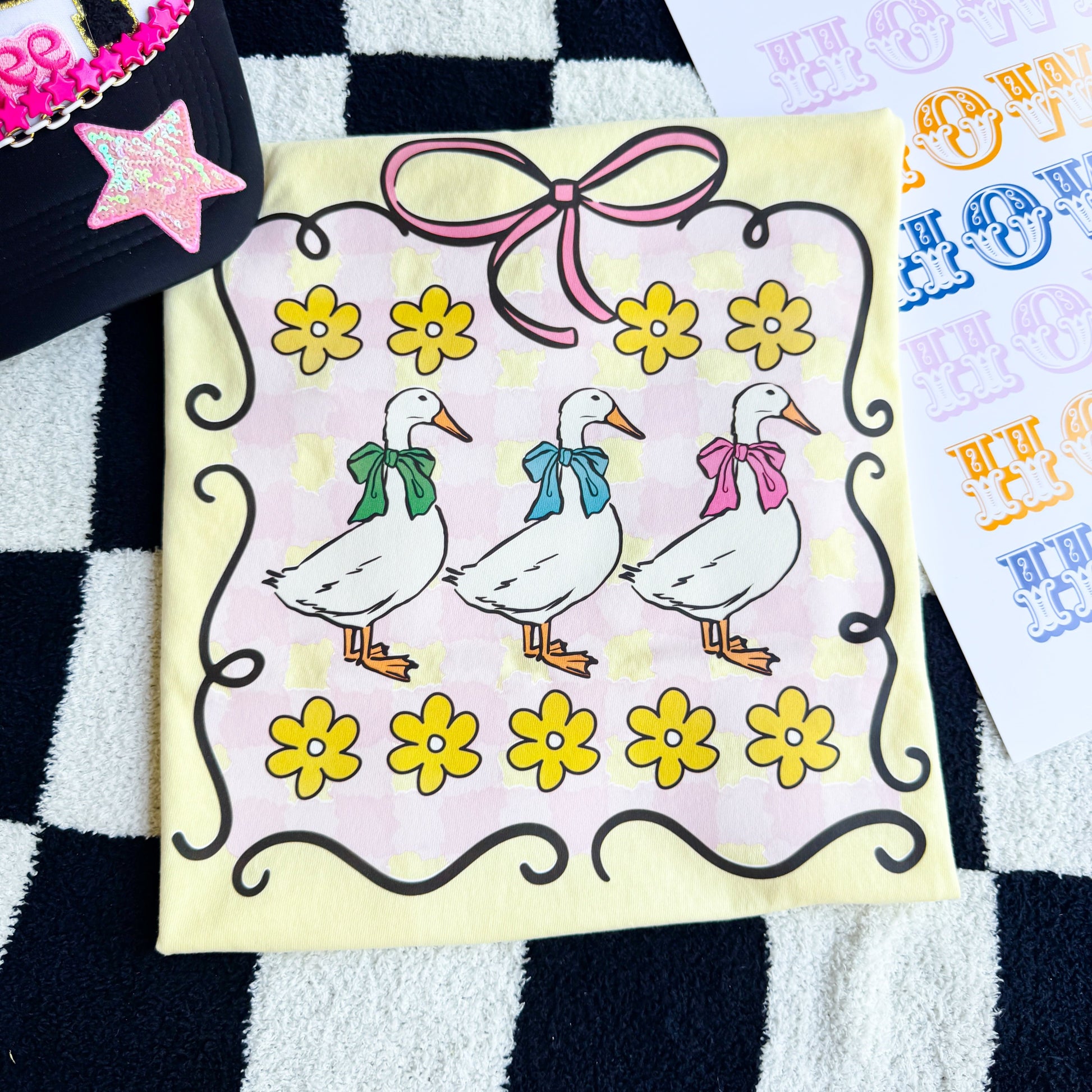š¦ Waddle into whimsy with thisĀ adorable goose tee featuring a pastel checkerboard pattern, yellow flowers, and three bow-tied geese marching in style. A sweet pick for Easter outfits, baby shower gifts, or any lover of all things charming and vintage.