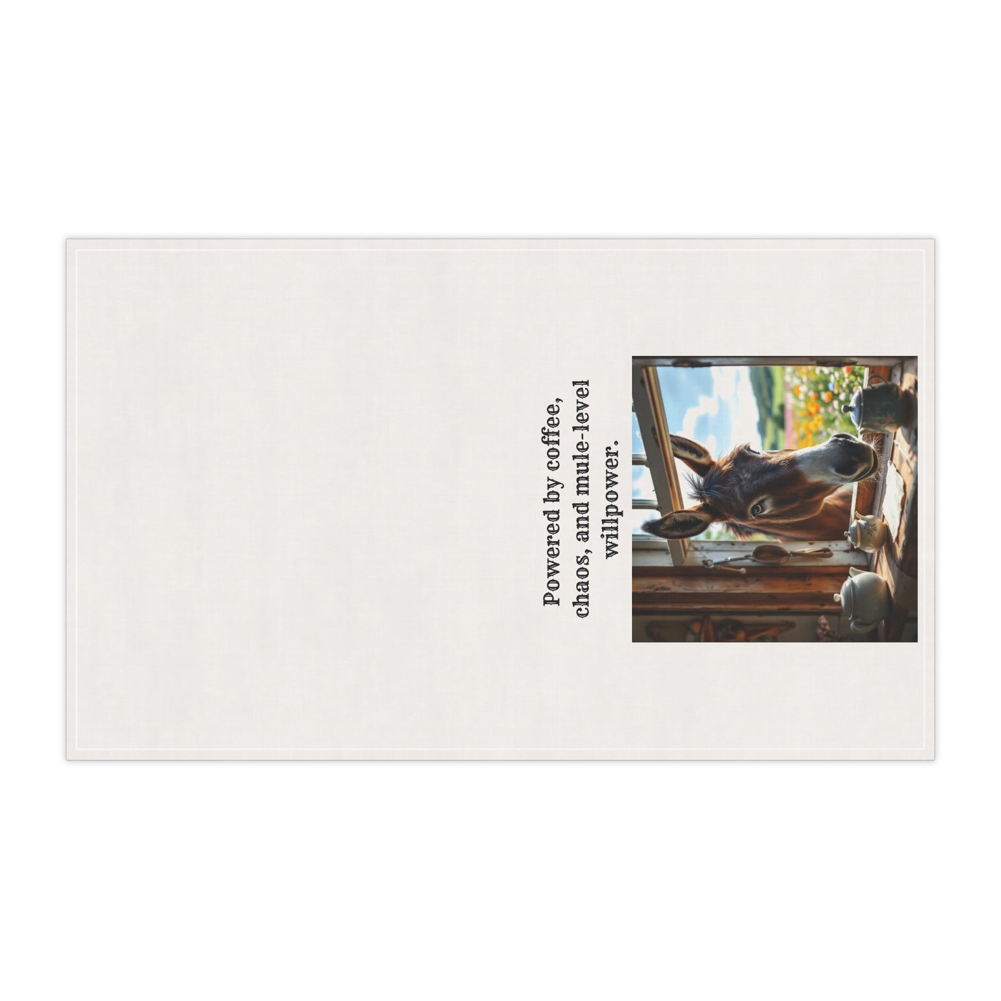 "Powered by coffee, caos and mule-level willpower" Show off your sass in style with this humorous Mule and Coffee loving towel. Gift for Home Chefs, Fun Mule Decor, Farmhouse Style, Kitchen Accessories