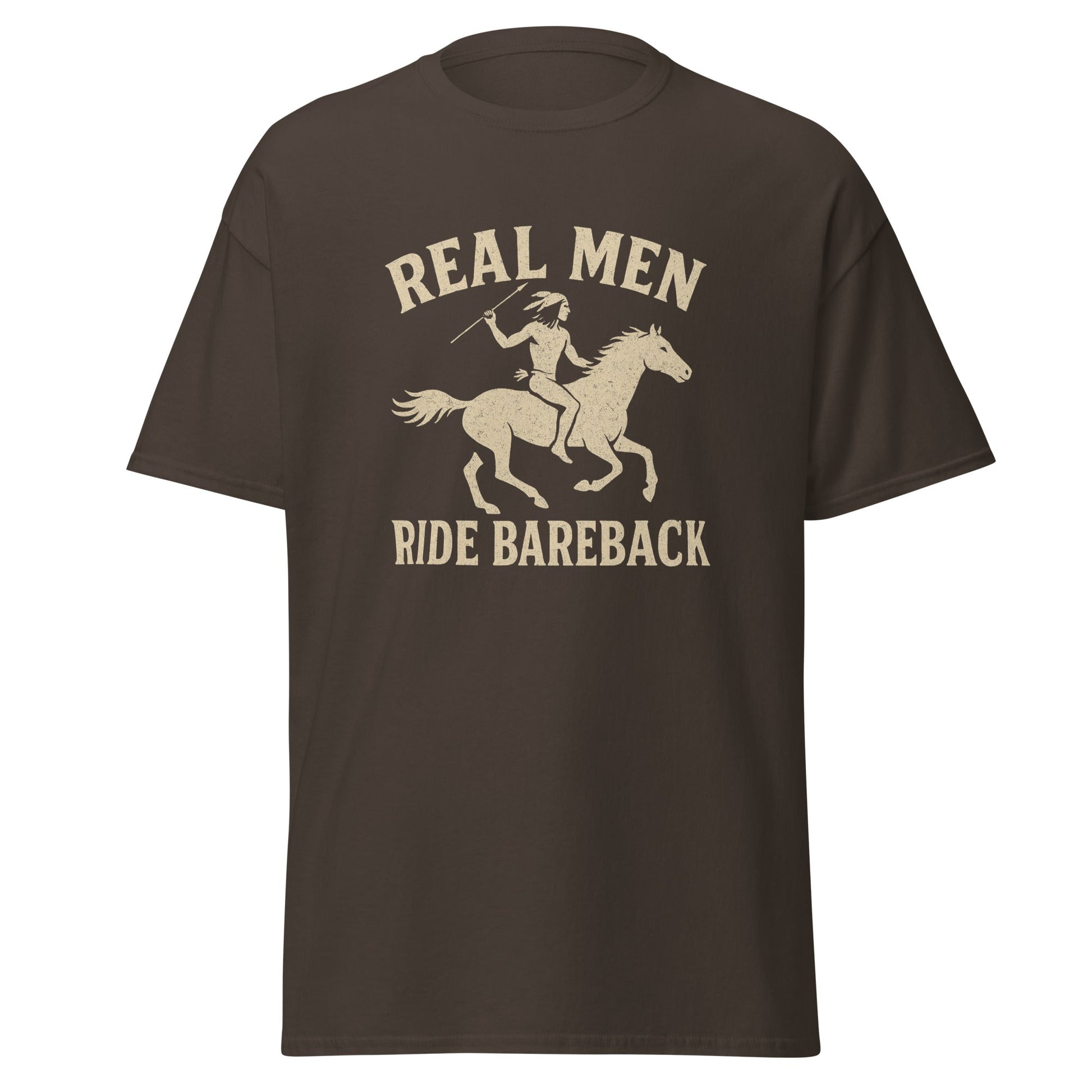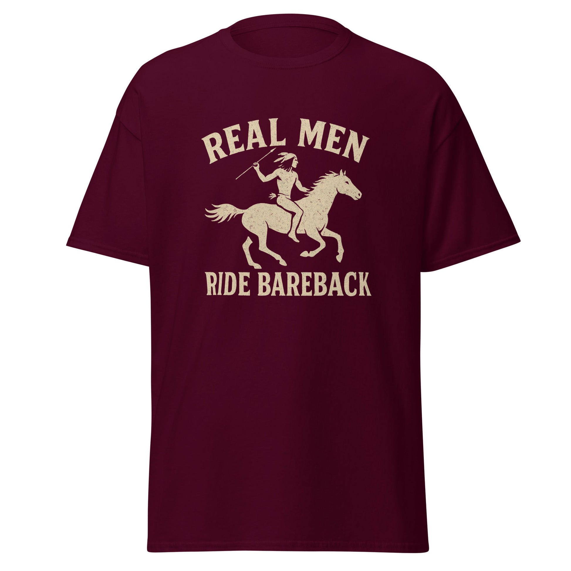 Show off your raw studliness with the Real Men Ride Bareback Tee. Featuring a distressed graphic design, this shirt brings rugged style and bold attitude to your casual look. Perfect for those who ride free and live loud.