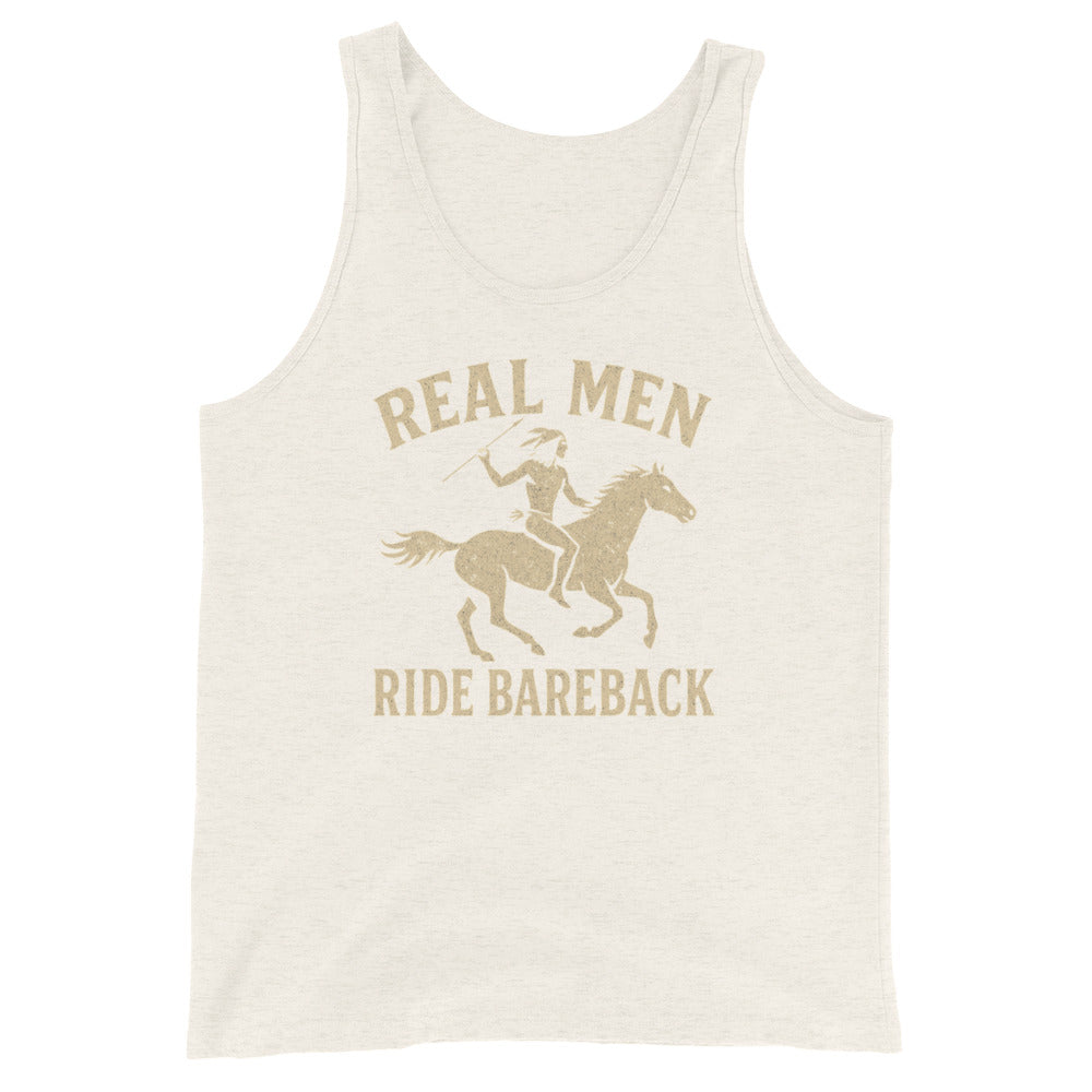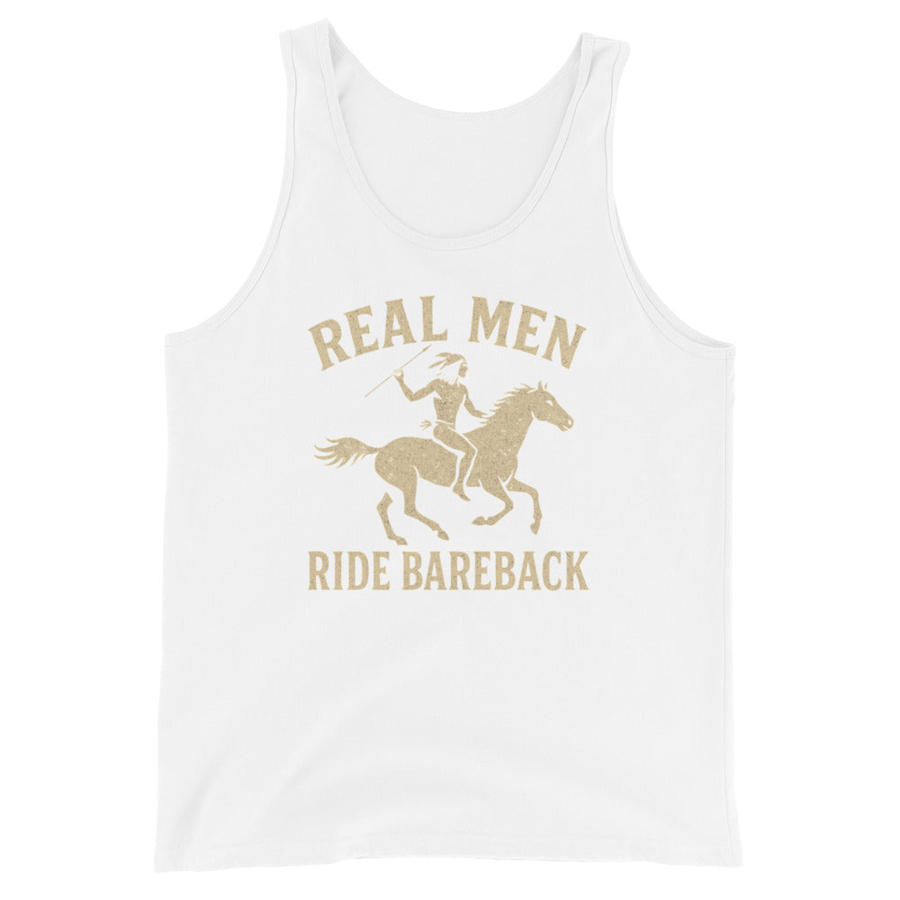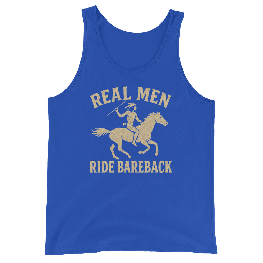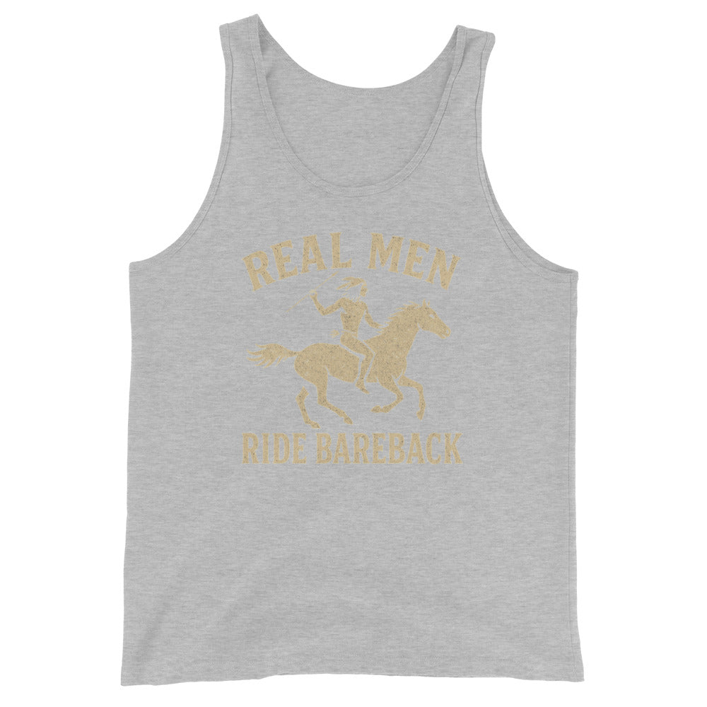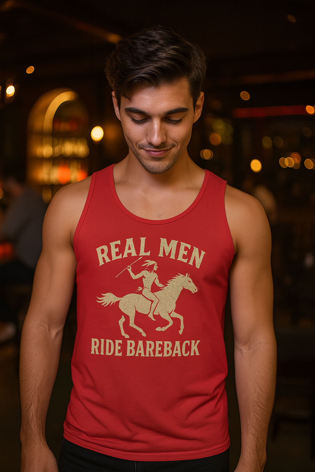 Show off your raw studliness with the Real Men Ride Bareback Tank. Featuring a distressed graphic design, this tank brings rugged style and bold attitude to your casual look. Perfect for those who ride free and live loud.