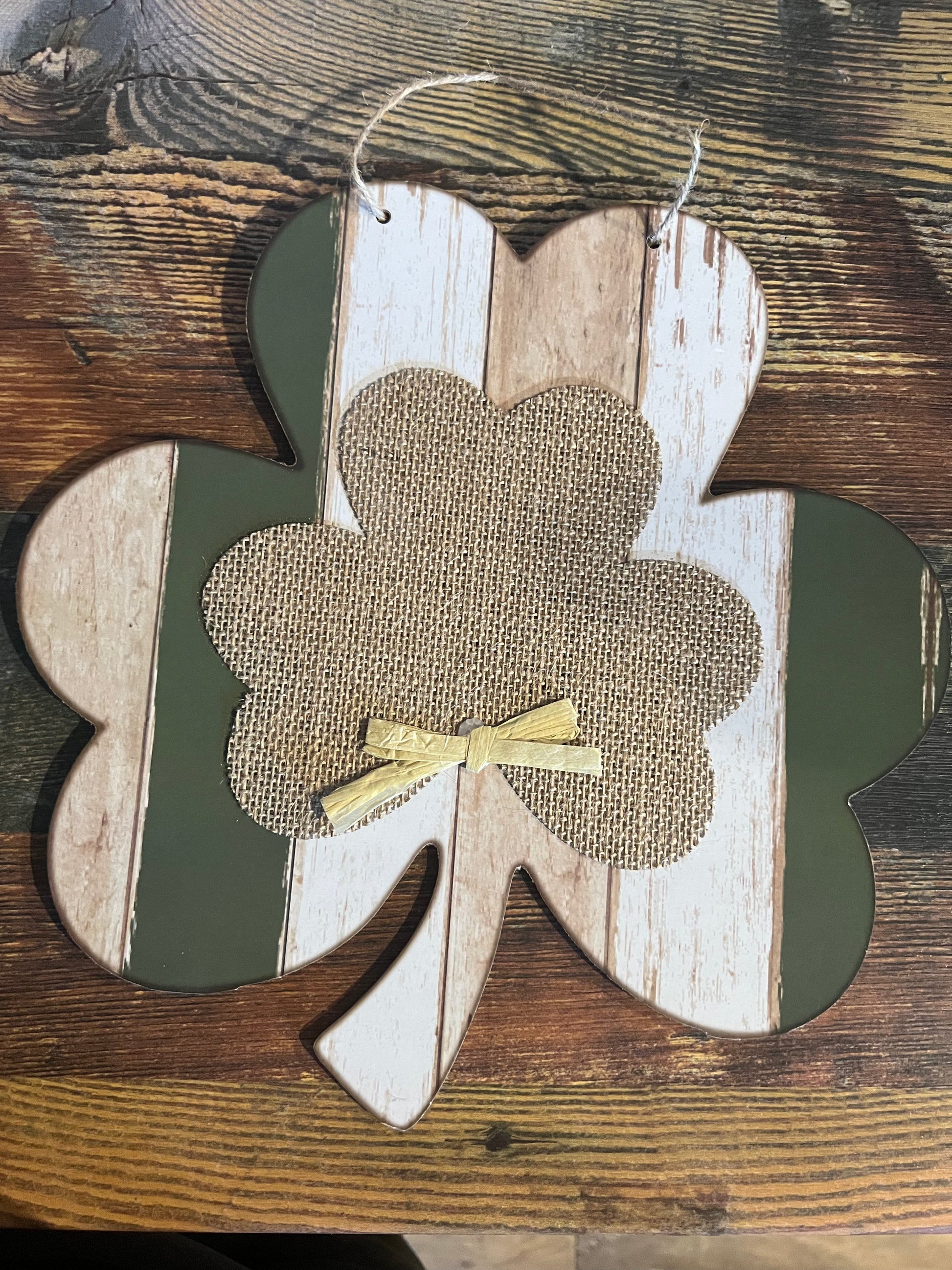 Constructed from natural wood, this shamrock boasts a Burlap center and elegant stripes in shades of winter, tan, and beige.