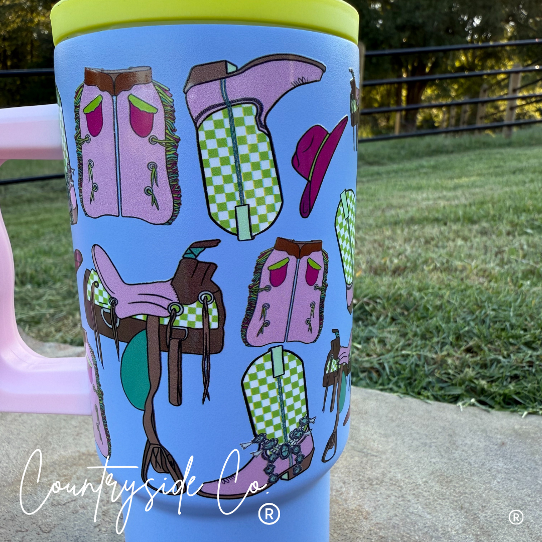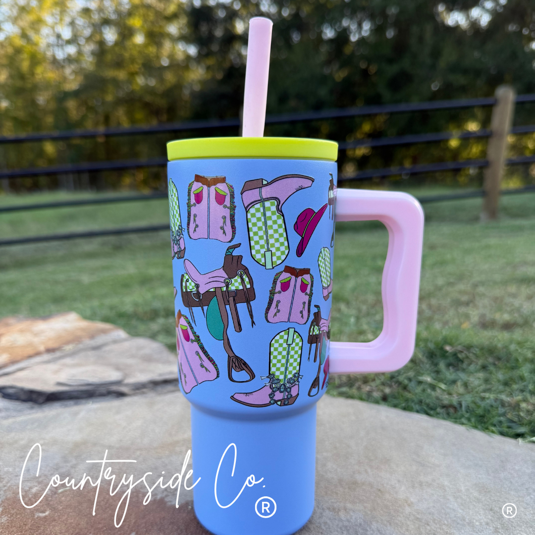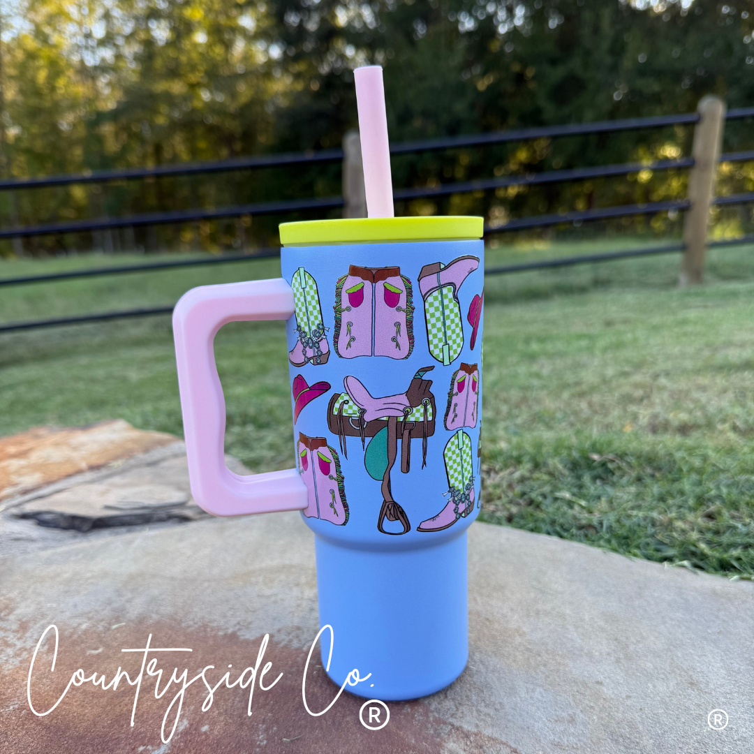 The Saddle Up 24oz Insulated Tumbler is made from sturdy stainless steel to handle all your wildest adventures packed into a smaller package. Featuring a handy reusable straw, it keeps your drinks hot or cold for hours on end. With its fun, rugged look and dependable performance, this tumbler is your perfect companion for every adventure. HANDWASH ONLY * Fun Size