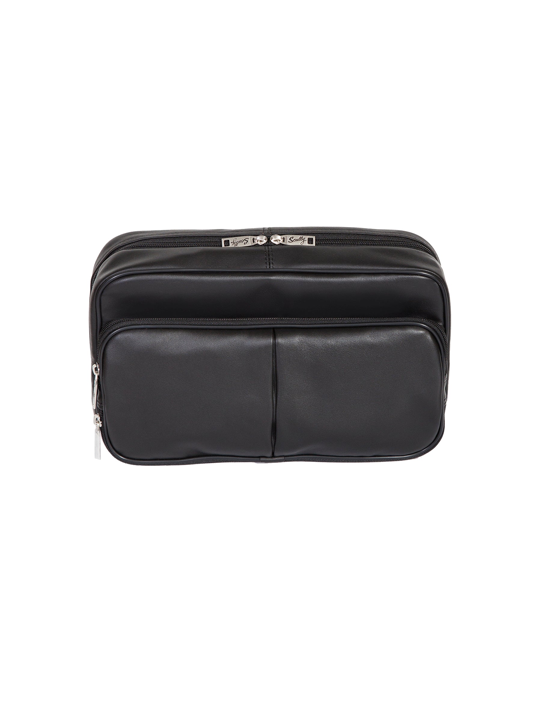 Leather travel kit. Exterior dual zip entry compartment. Roomy main compartment w/open pockets to hold travel bottles toothbrush. Removeable zip mesh pocket. Elastic loop for brush. Rear zip compartment includes hanger. Import.