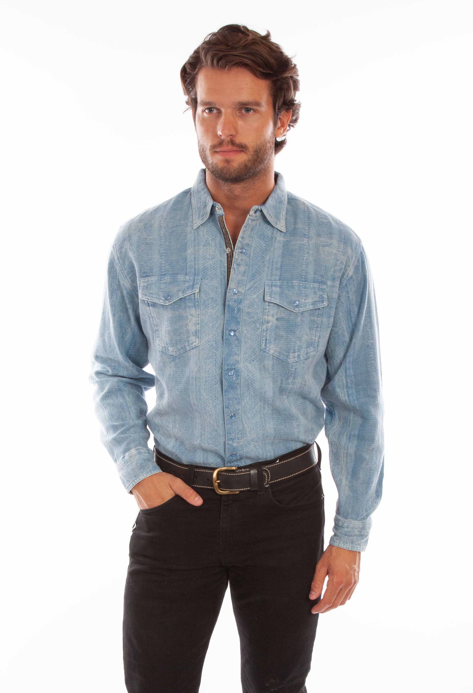 Scully overdyed signature shirt. Features snap front cuffs & pocket closures. Two front chest pockets & point collar. 100% cotton overdyed fabric. Contrast trim & ribbon are on the inside placket inner collar and cuffs. Import. Machine washable.