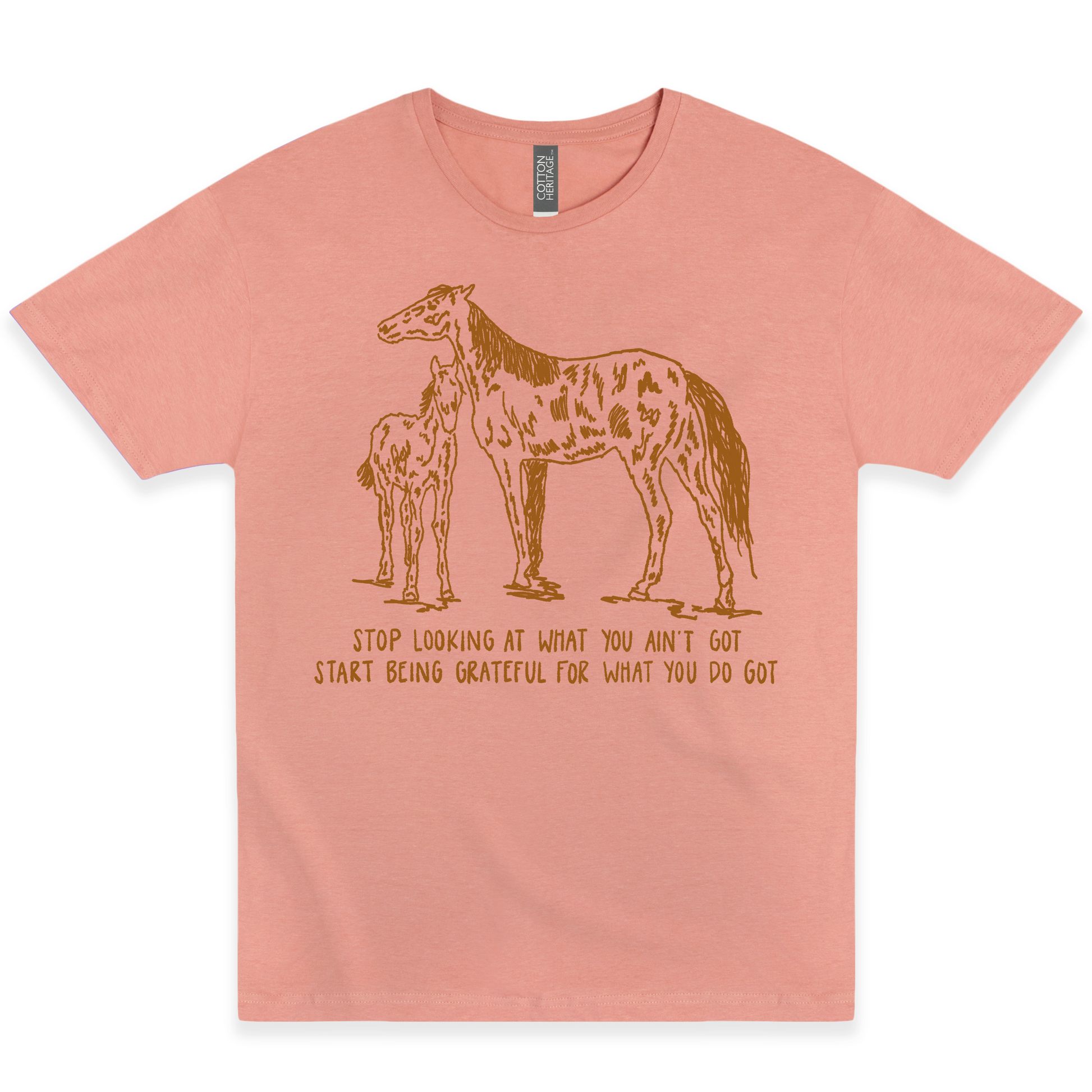 Gratitude looks good on you. The Simple Blessings Tee showcases a rustic, hand-drawn horse and foal design with a heartfelt message: "Stop looking at what you ain't got, start being grateful for what you do got." With its cozy unisex fit and soft, durable fabric, this tee keeps your perspective grounded and your style classic.
