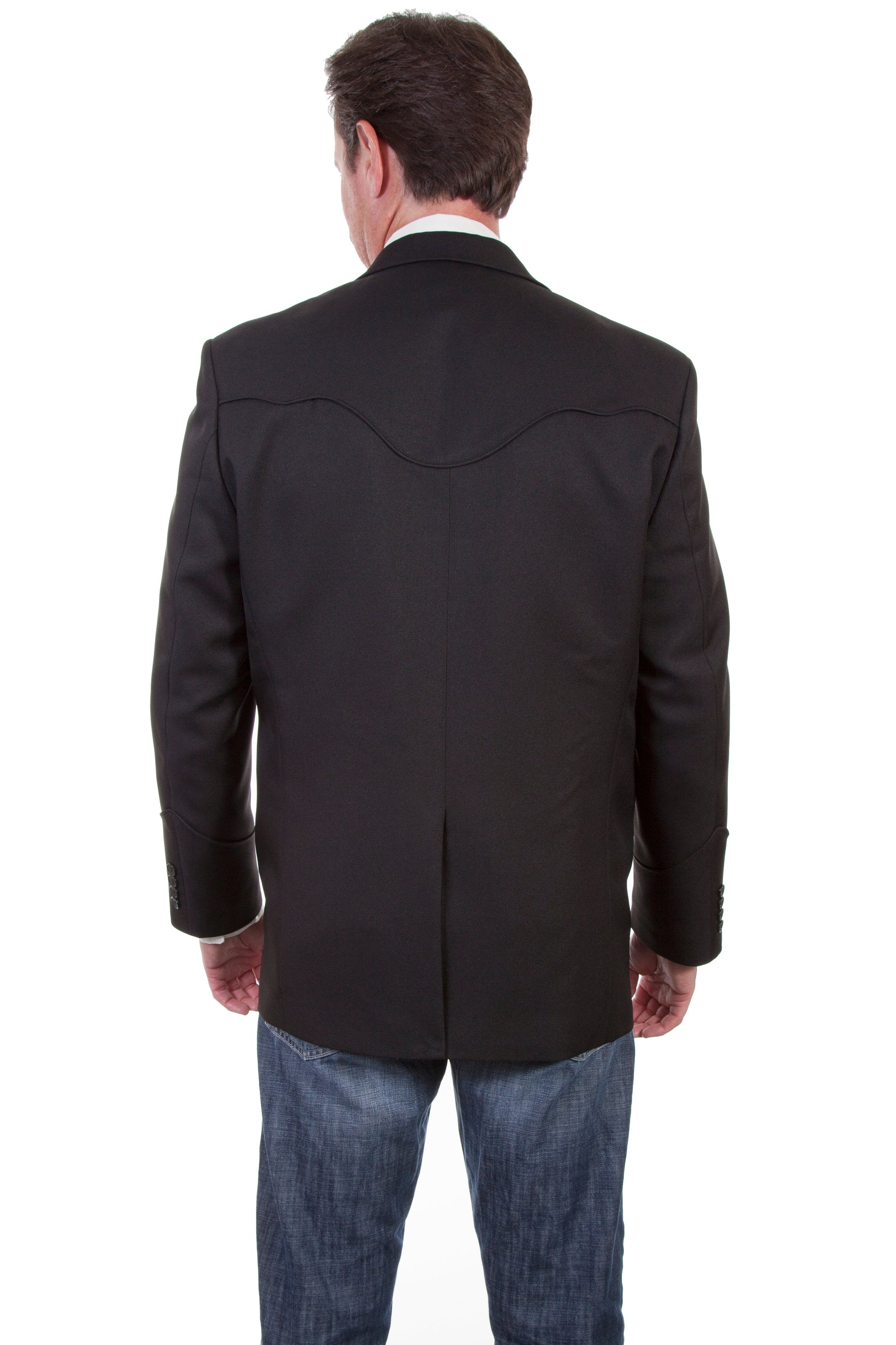 Western blazer. This beautifully tailored traditional western blazer features a two button front notched lapels two chest smile pockets and two lower smile pockets. The back features an open vent. 100% polyester. Dry clean only.