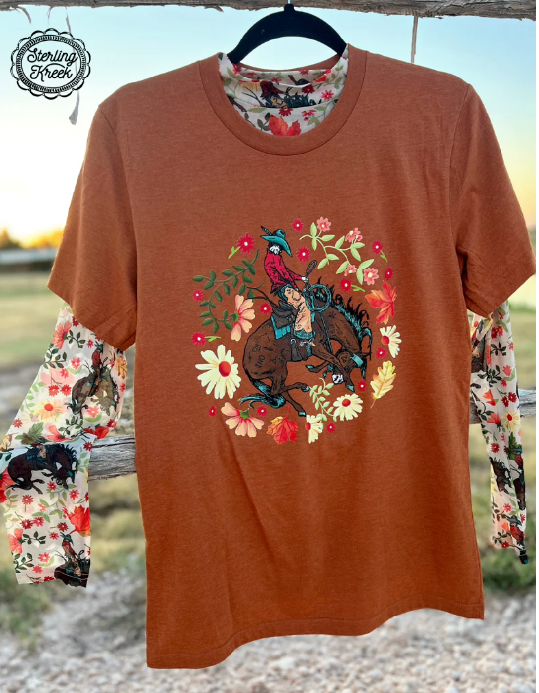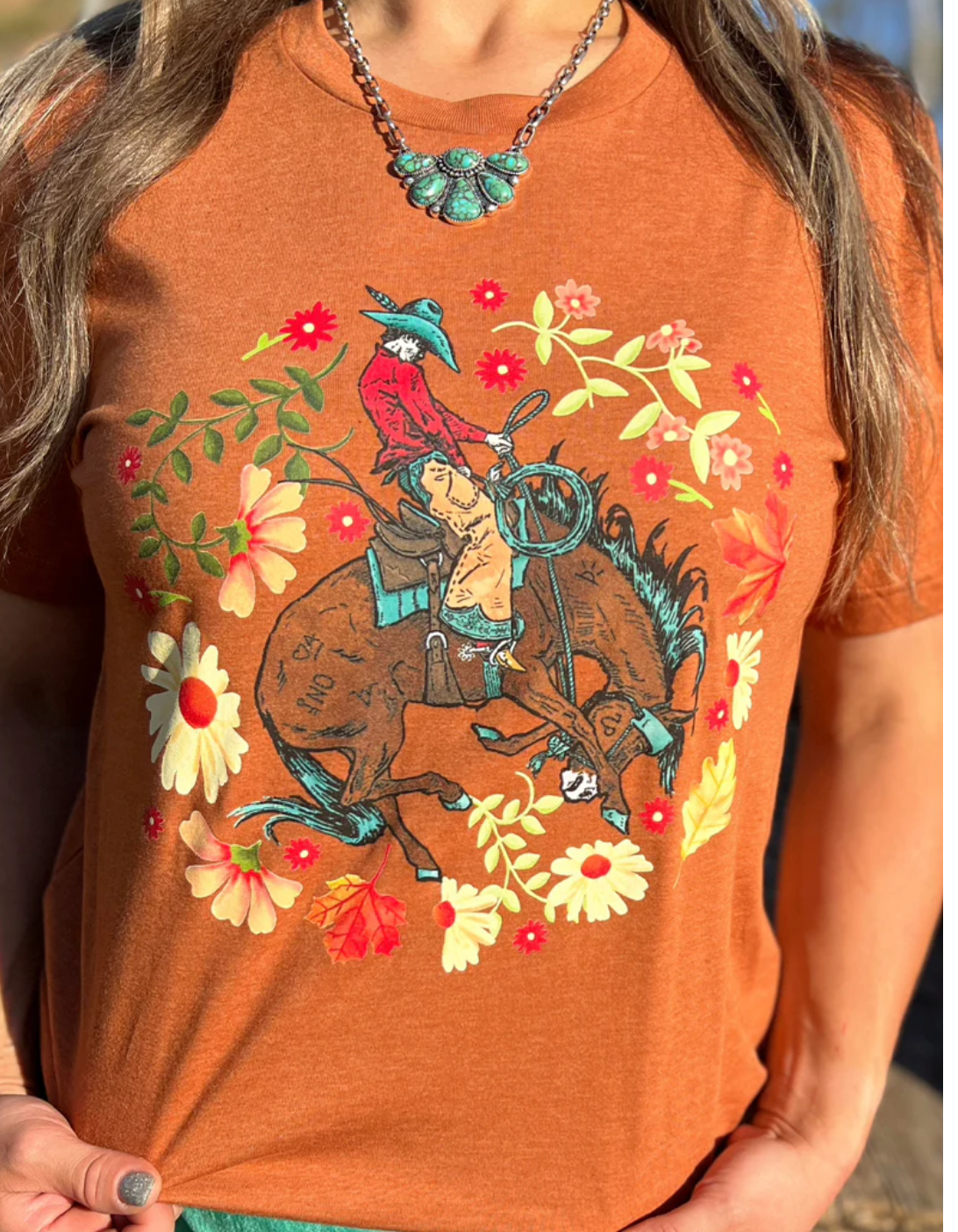 Saddle up and stand out in this Floral Bronc Tee! This orange tee features a whimsical cowboy on a bronc surrounded by a blooming floral pattern. Perfect for adding a pop of fun to any outfit. Yeehaw!