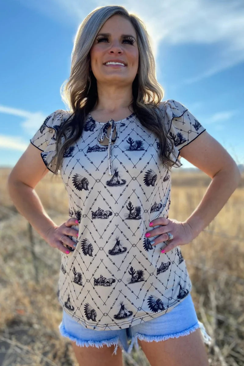 This short sleeve ruffle top showcases a stunning southwestern pattern with a charming bow accent. The delicate ruffled sleeves frame the shoulders beautifully, while the bold geometric design draws inspiration from desert landscapes and traditional southwestern aesthetics. Lightweight and comfortable, it's ideal for warm weather styling with your favorite bottoms. Layer it over a camisole or wear it solo for an effortless, bohemian-inspired look that transitions seamlessly from day to night.
