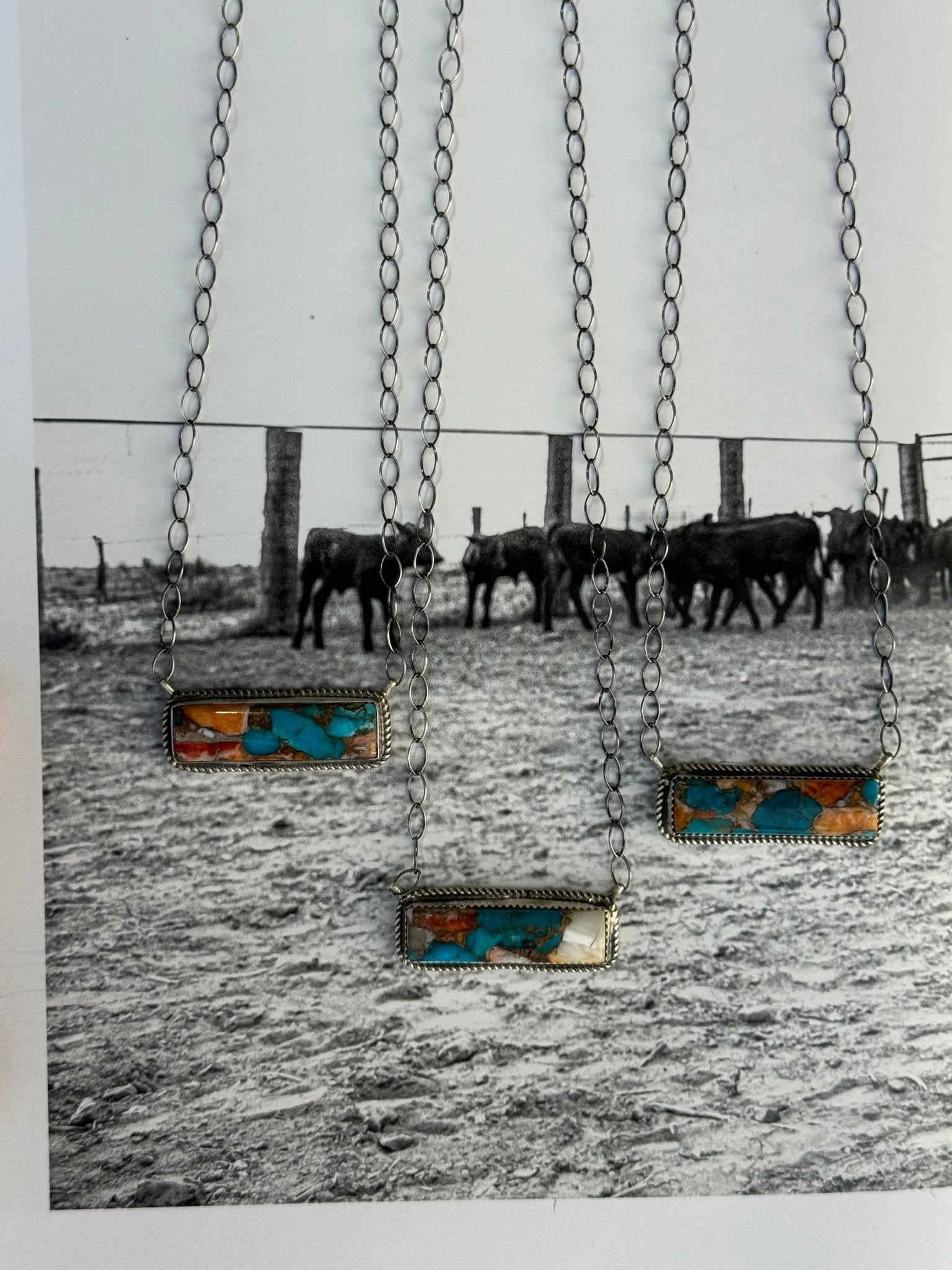 The Spiny Oyster Turquoise Bar Necklace is the perfect fusion of bold southwestern charm and effortless elegance! Featuring a striking mix of spiny oyster and turquoise stones set in a sleek bar design, this necklace adds the perfect pop of color to any outfit.