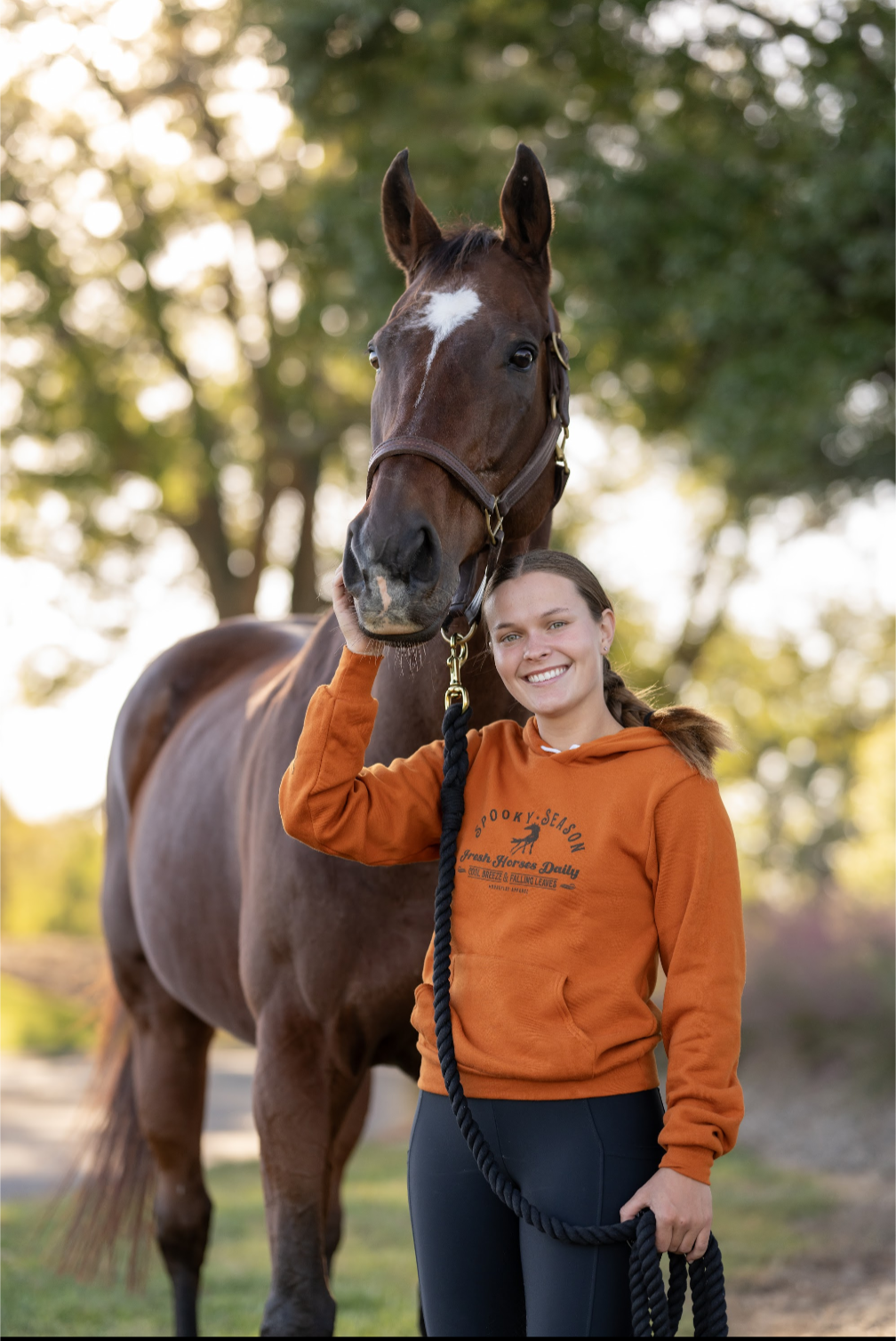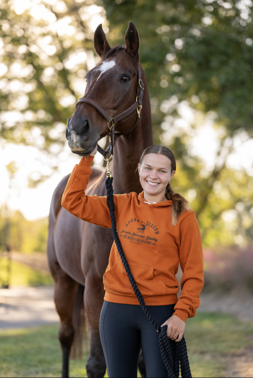 We are adding to our Spooky Season family this year! Our classic pumpkin color is now available in a hoodie, PLUS the ink glows in the dark! Absolutely perfect for Spooky Season, grab yours while we have them in stock, they're going to fly off the shelves faster than your horse spooking at a garbage bag flapping in the fall breeze!