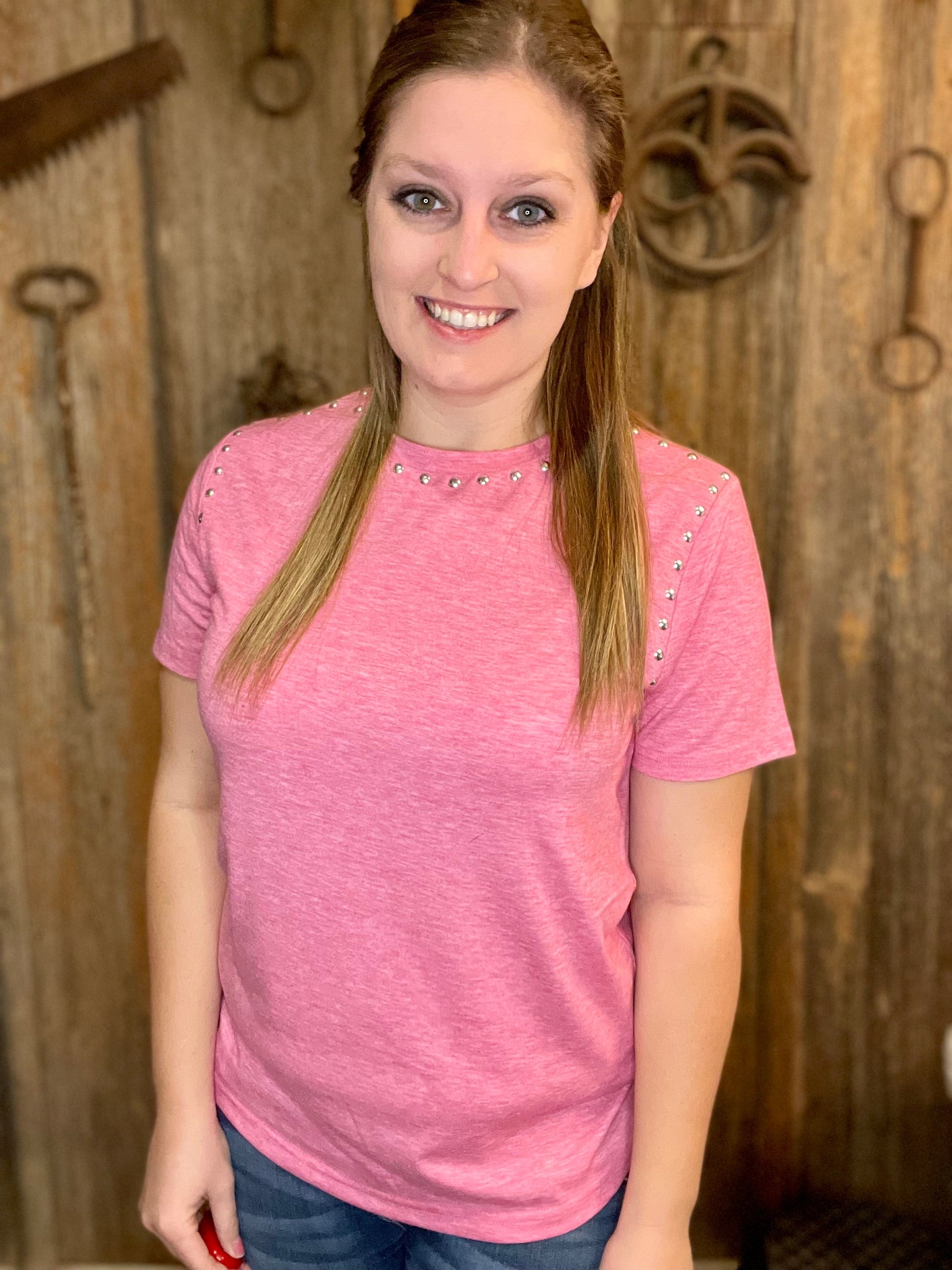 "Unleash your inner star with our Starry Stud Tee. This true-to-size pink tee features eye-catching stud details along the collar and sleeve hems. Made with soft stretchy material, it offers both comfort and style. Perfect for adding a touch of glamour to any outfit. Own the spotlight in our Starry Stud Tee!"