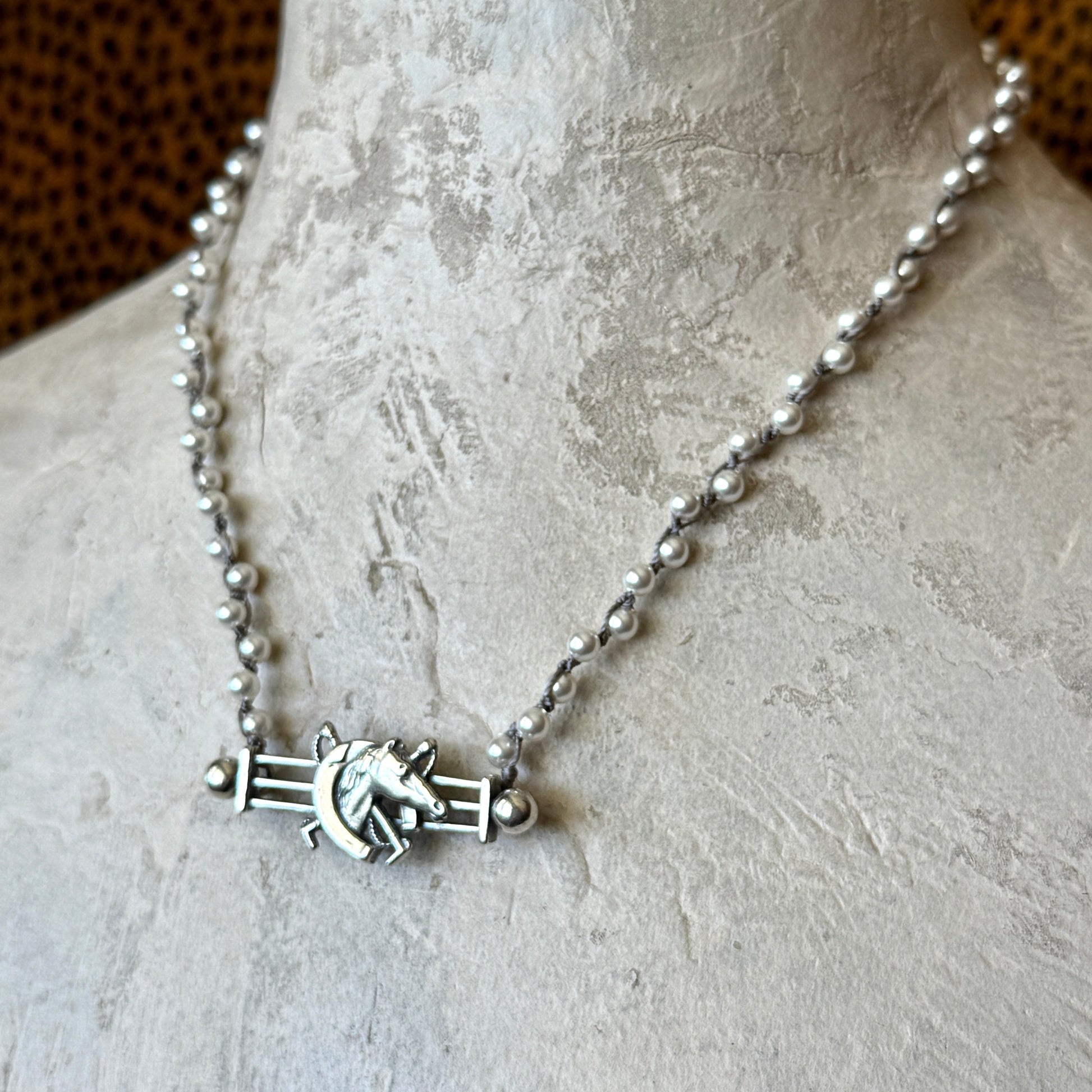 This necklace consists of a lovely 2" long by solid sterling silver gate, embellished with a horse head nested in a horseshoe with crossed whips. The centerpiece is suspended from a necklace of offset knotted Swarovski pearls with an overall length of 18 1/2".