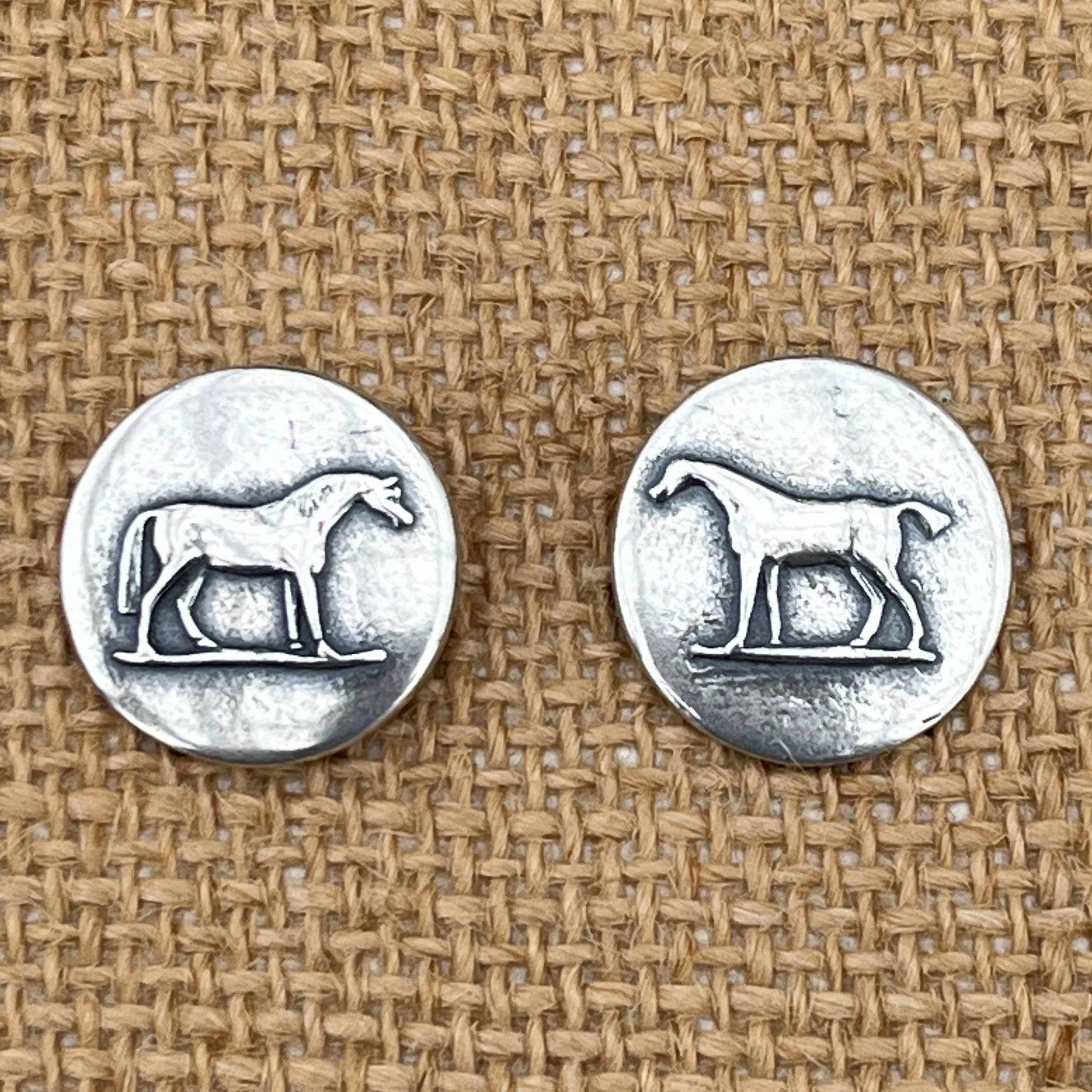 These lovely earrings consist of of two vintage Stubbs horses facing each other. Note that the left facing horse has a lovely docked tail in the tradition of horses from the late 1800's while the right facing horse has a full tail. These earrings are solid sterling silver and measure 3/4" in diameter.