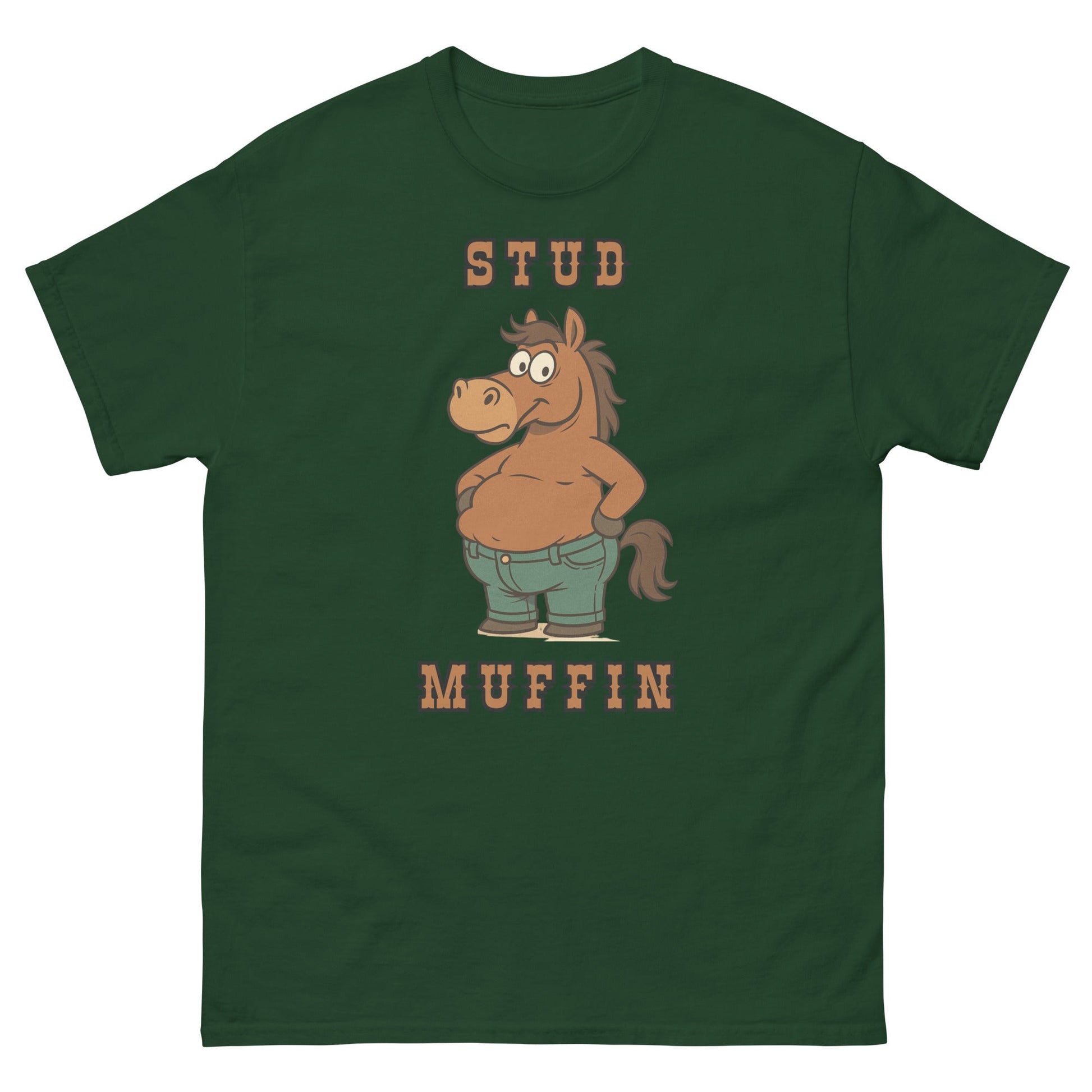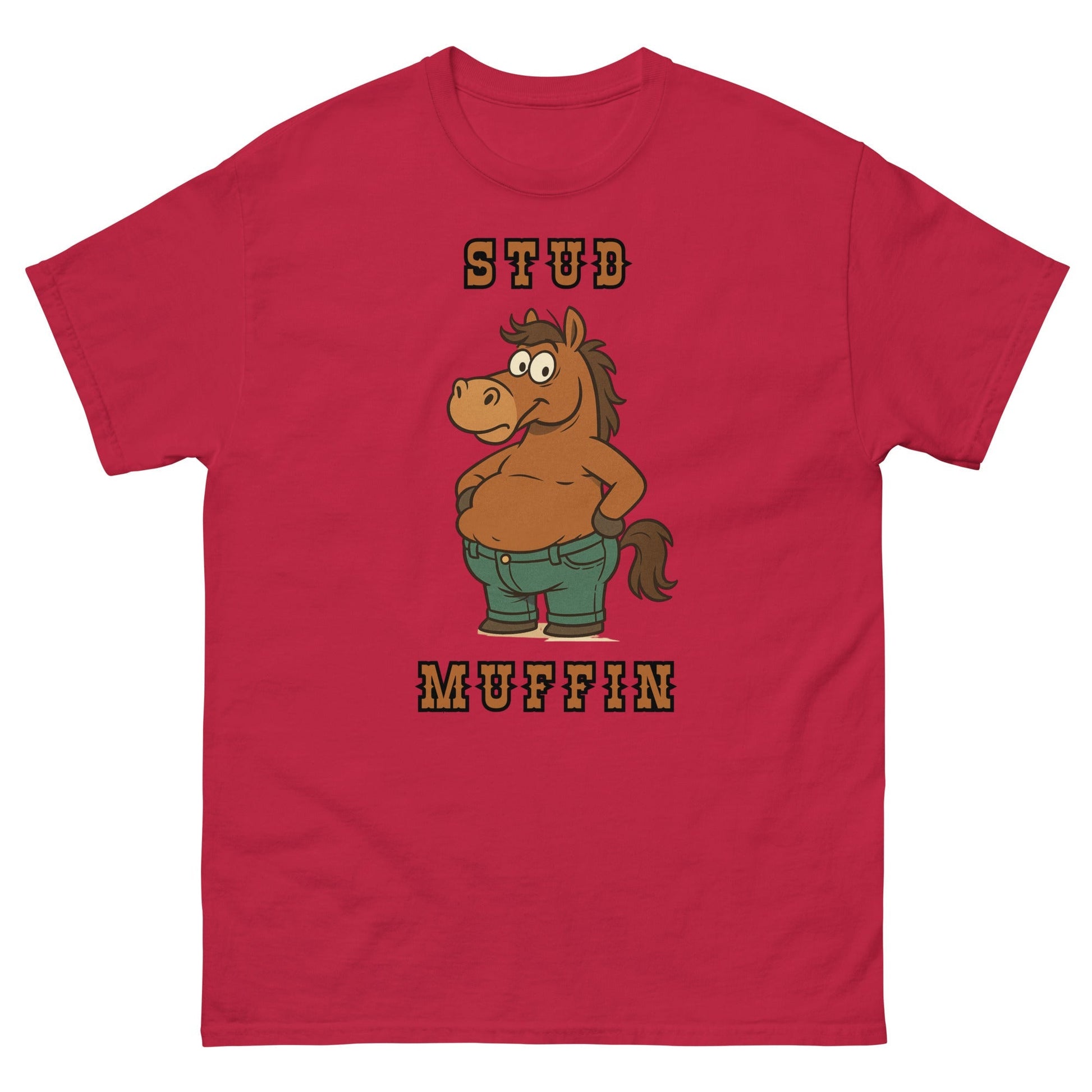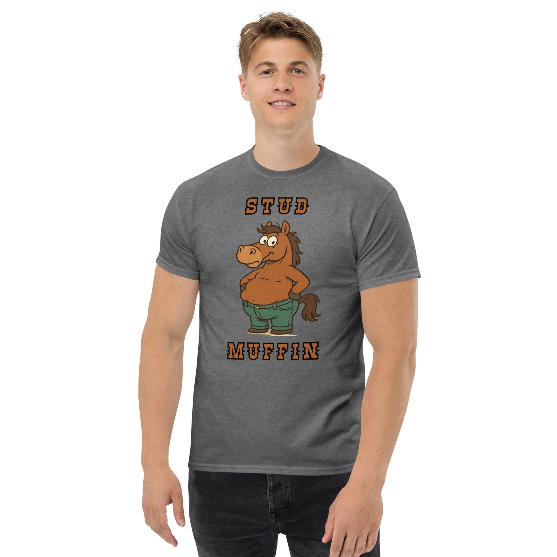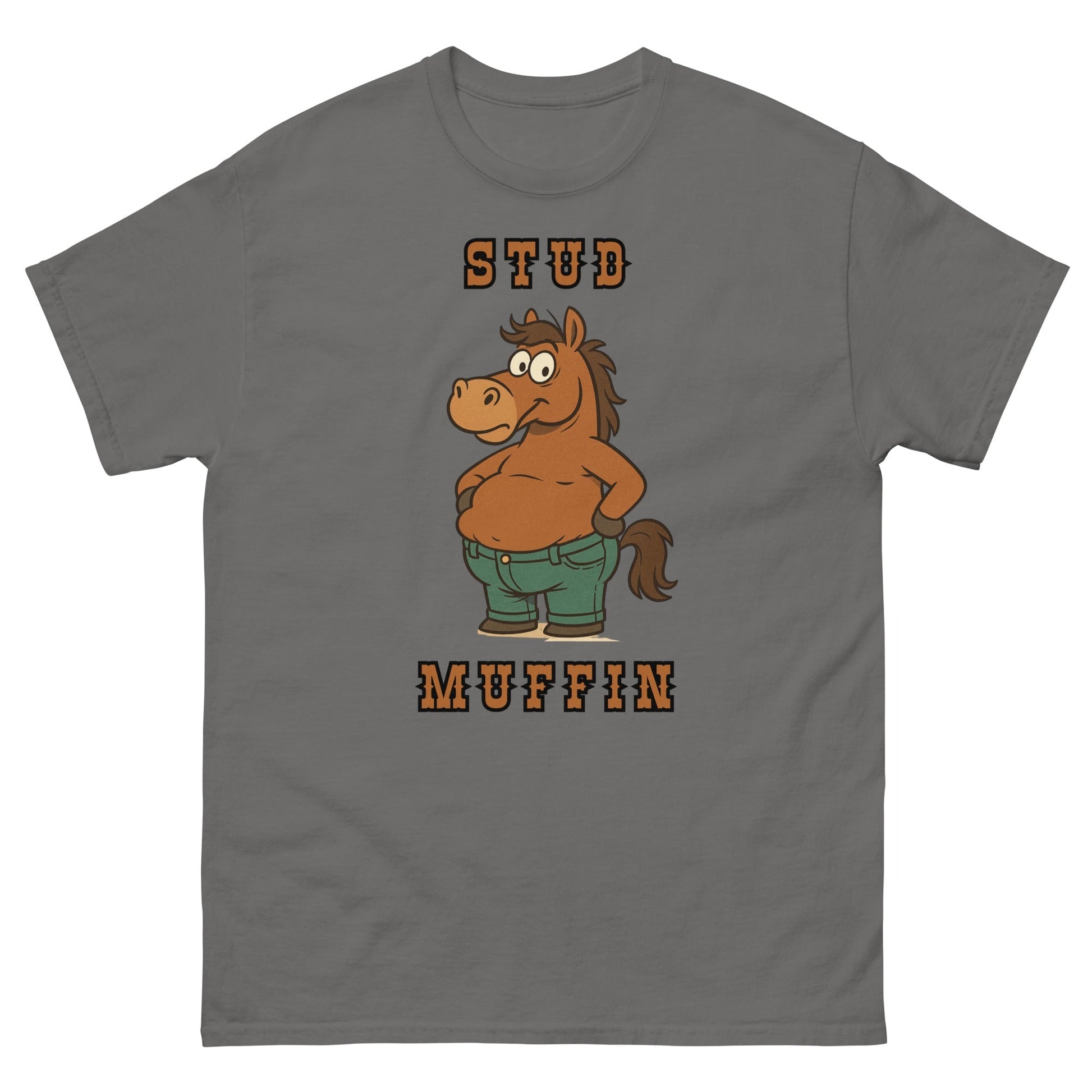 Show off your cowboy charm with the Stud Muffin Graphic T-Shirt. This playful western wear tee combines farm humor and a fun twist on the classic "muffin top", perfect for men who like to keep their style lighthearted and bold. Sizes up to 3XL! Comfortable and casual, it’s a great choice for adding a bit of humor to your everyday ranch or casual look.