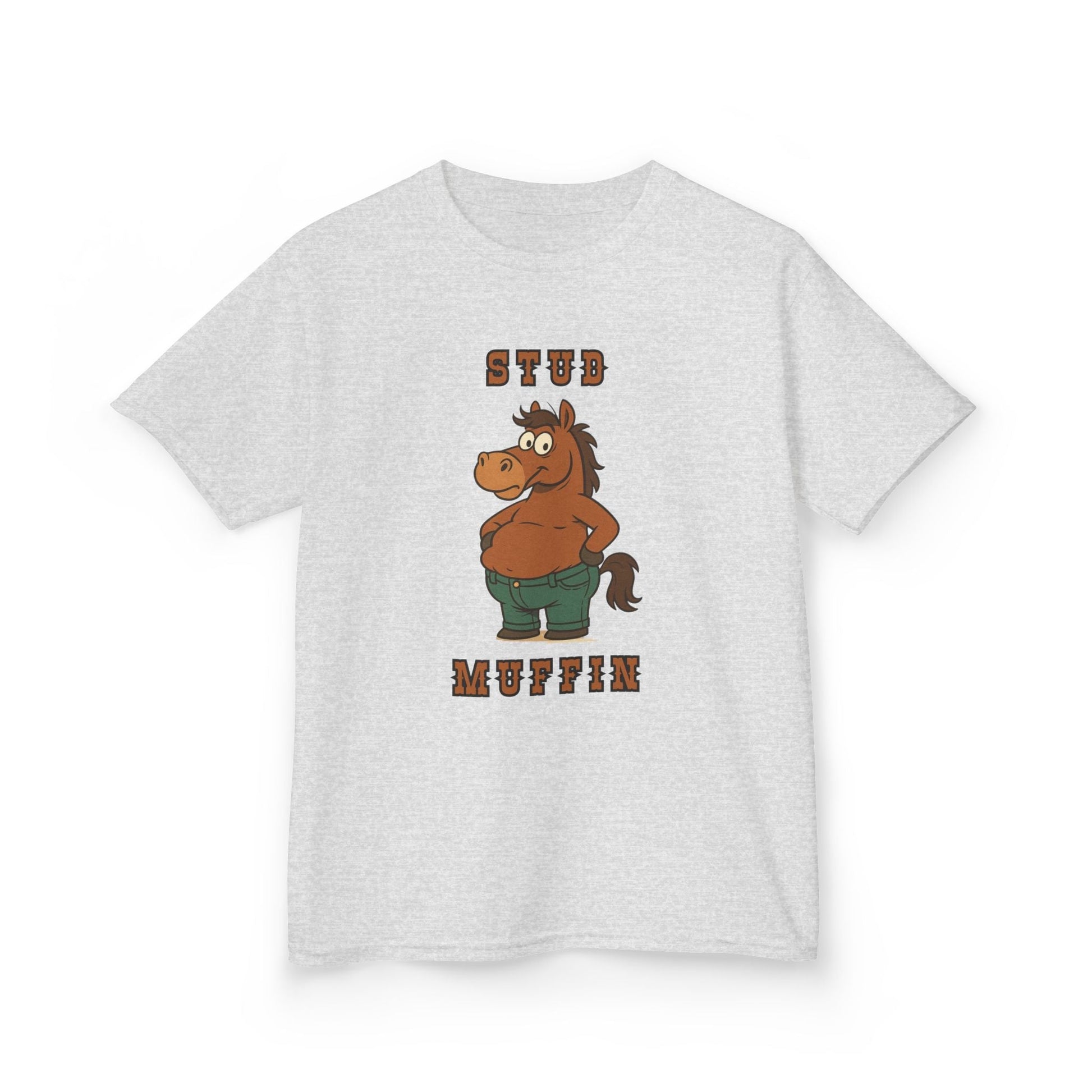 This funny graphic tee featuring a stud muffin - horse with a muffin top - is perfect for everyday wear and back to school. It adds a touch of fun and cuteness to a child's wardrobe. Ideal for children who enjoy quirky and humorous designs, making it a great gift for birthdays and holidays.