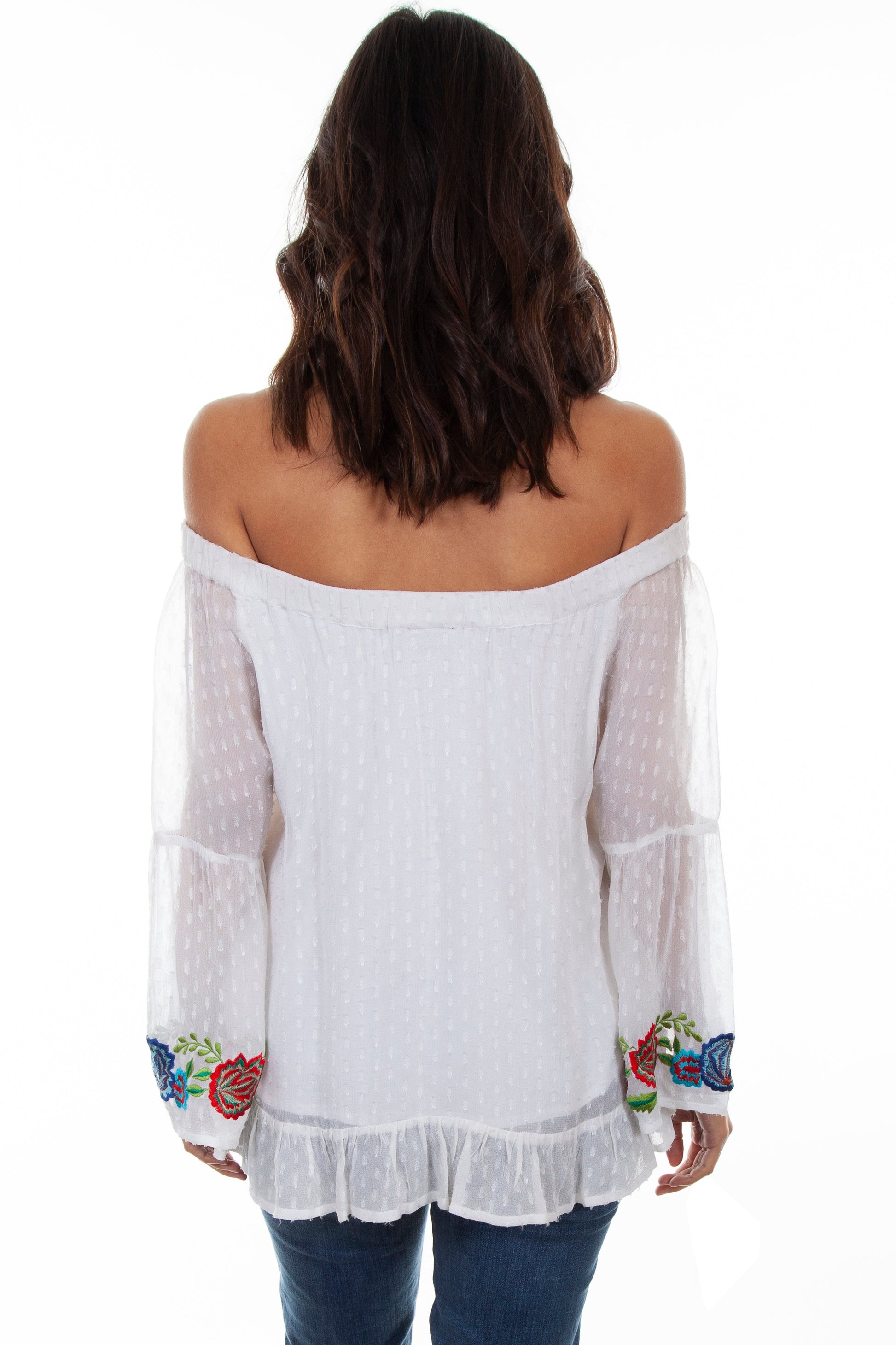 Swiss dot with embroidery. This must have stylish flowy swiss dot tunic is as flattering as it is comfortable. It features an inspired floral embroidery on the front and on the bell sleeves. It has a spunky ruffle at the hemline. Import.