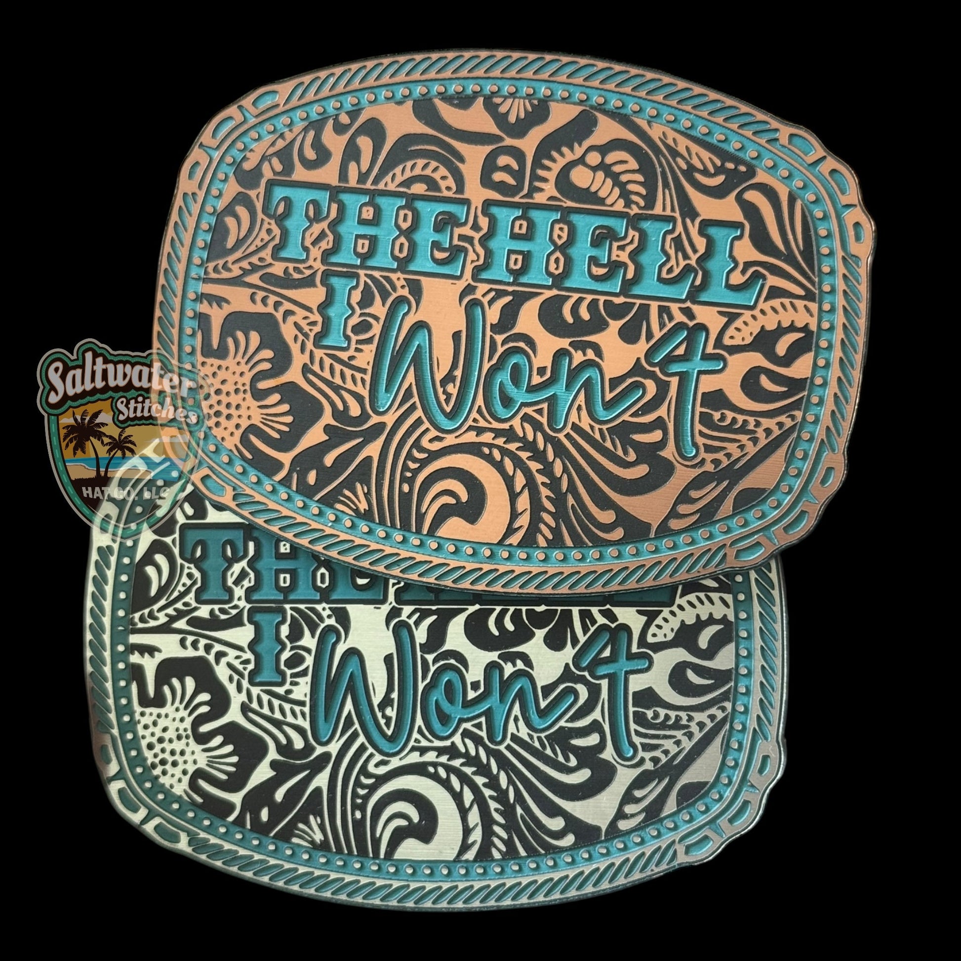 The Hell I Won't tri layer acrylic in copper/turquoise/black or stainless/turquoise/black. Size: 3.0w x 2.29h
