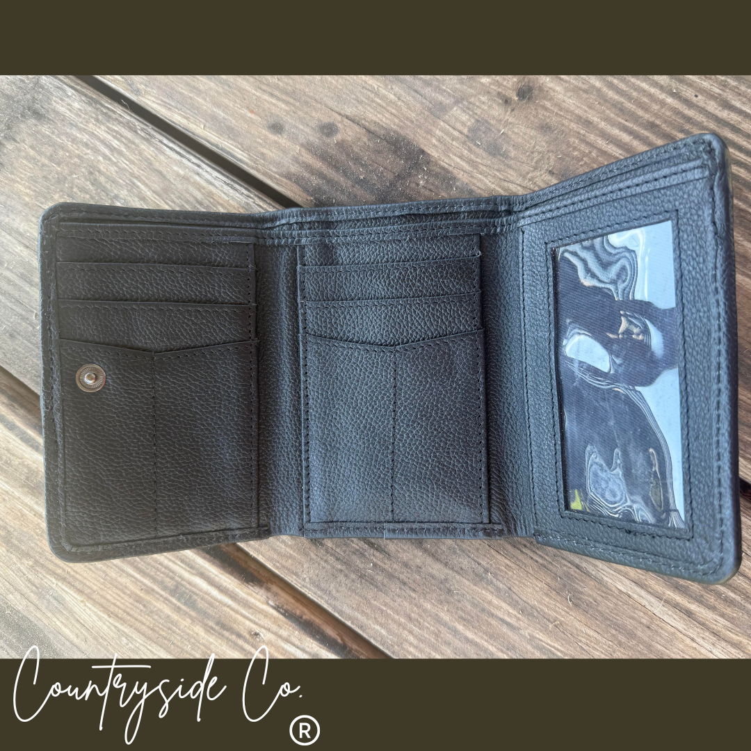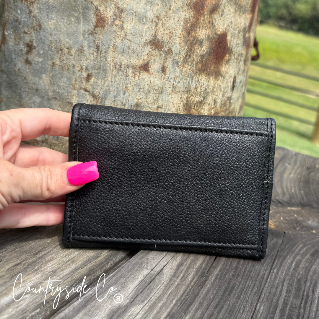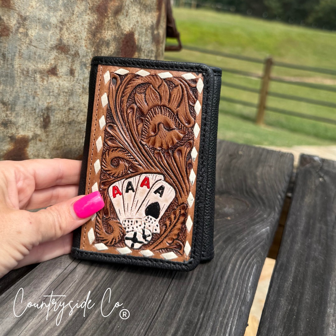 The Little Gambler Leather Wallet brings a playful twist to classic style with its handpainted, tooled leather front. Inside features a unique cowhide panel. The tri-fold wallet has 7 credit cards slots, 2 small pockets and a cash pocket. Perfect for those who like a little fun with their function.