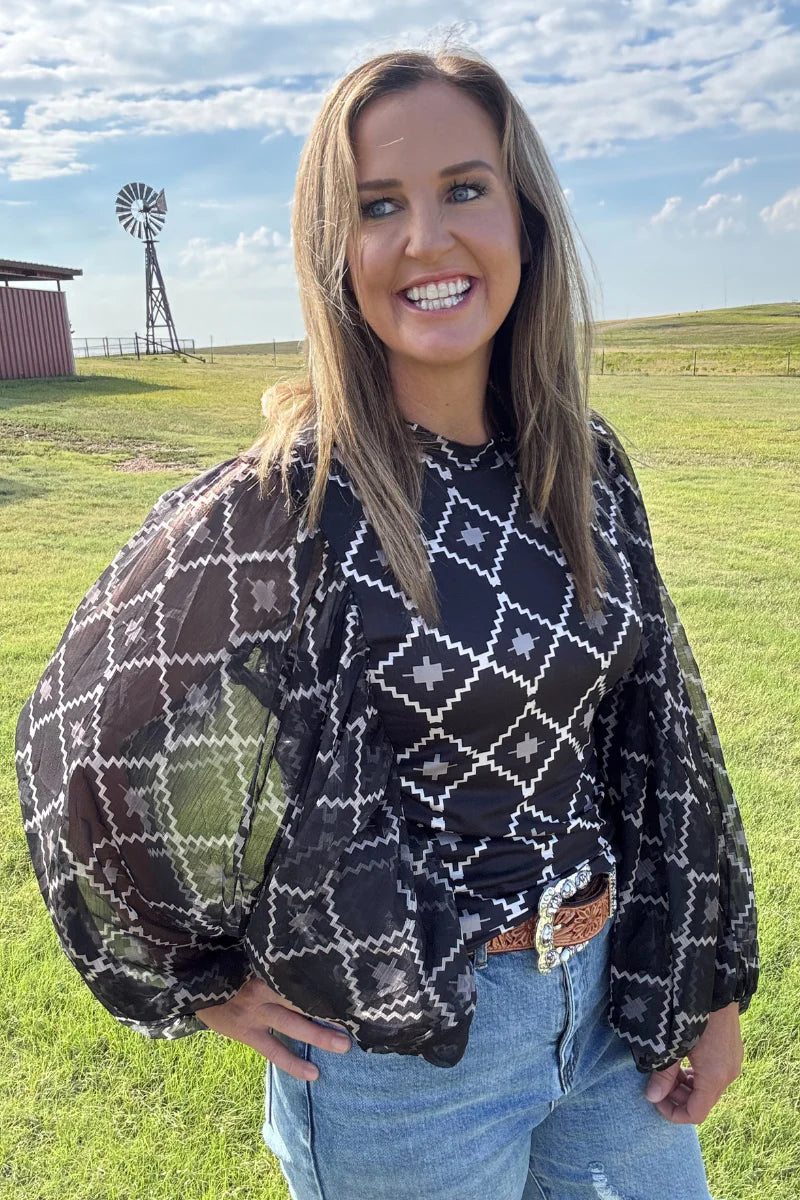 Elevate your style with The Way It Is Top, featuring a dynamic black and white Aztec pattern that adds bold, graphic appeal. The bubble sleeve design offers a trendy silhouette that balances volume with sophistication, perfect for making a statement anywhere. Lightweight and comfortable, this top effortlessly combines eye-catching style with easy wearability to enhance your everyday wardrobe.
