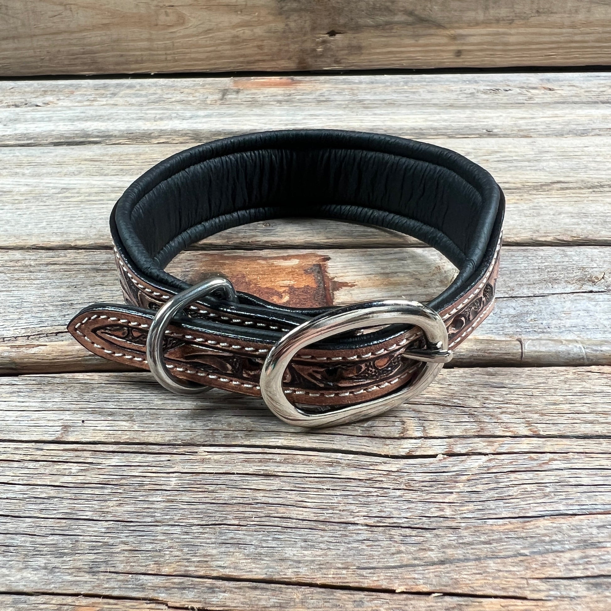 This light oil dog collar is hand tooled with a floral design. It is decorated with a beaded pattern in red, yellow, blue, green and white. The collar is tooled on the adjustment strap and has padded leather on the neck portion for your puppies comfort.