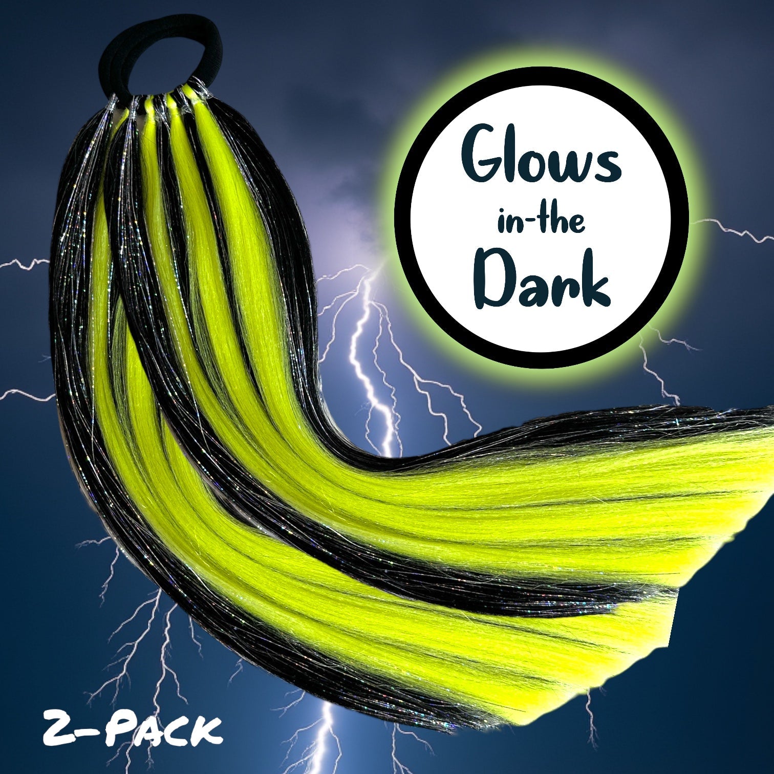 Glow-in-the-dark hair reacts to UV light. Leave them exposed to sunlight for a few minutes to “charge” them up and the glow, baby glow! Glow-in-the-dark hair cannot be exposed to high temperature heat. Store in their plastic sleeves and ssmooth with a wide-toothed comb.