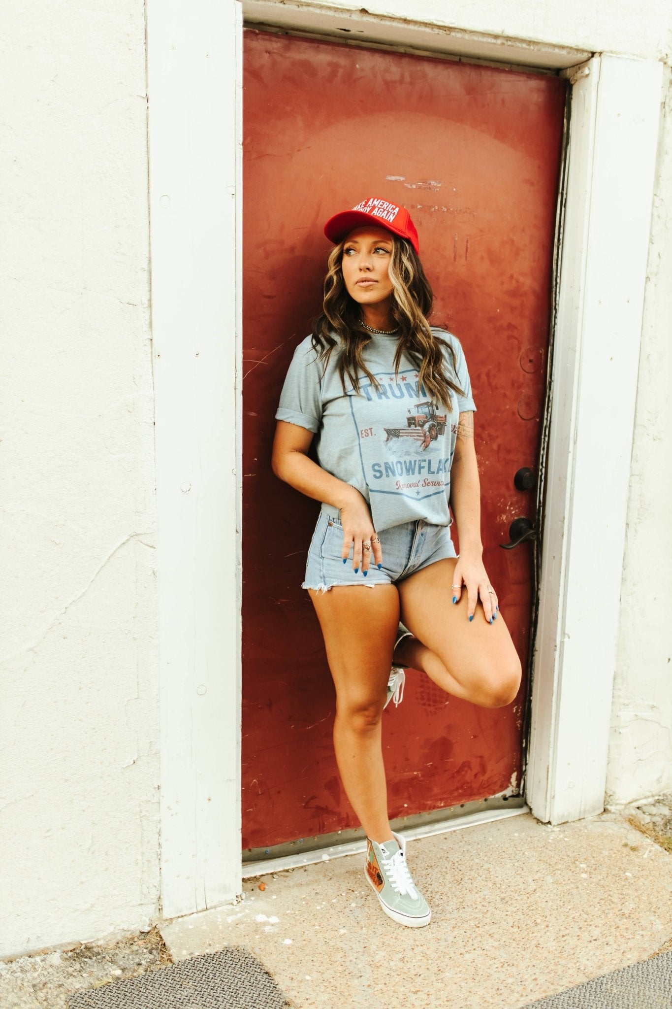 Stand out and show your support with Trump's Snowflake Removal Service Graphic Tee! This eye-catching tee combines political flair with a touch of western style, perfect for supporters looking to show their enthusiasm in a unique way.