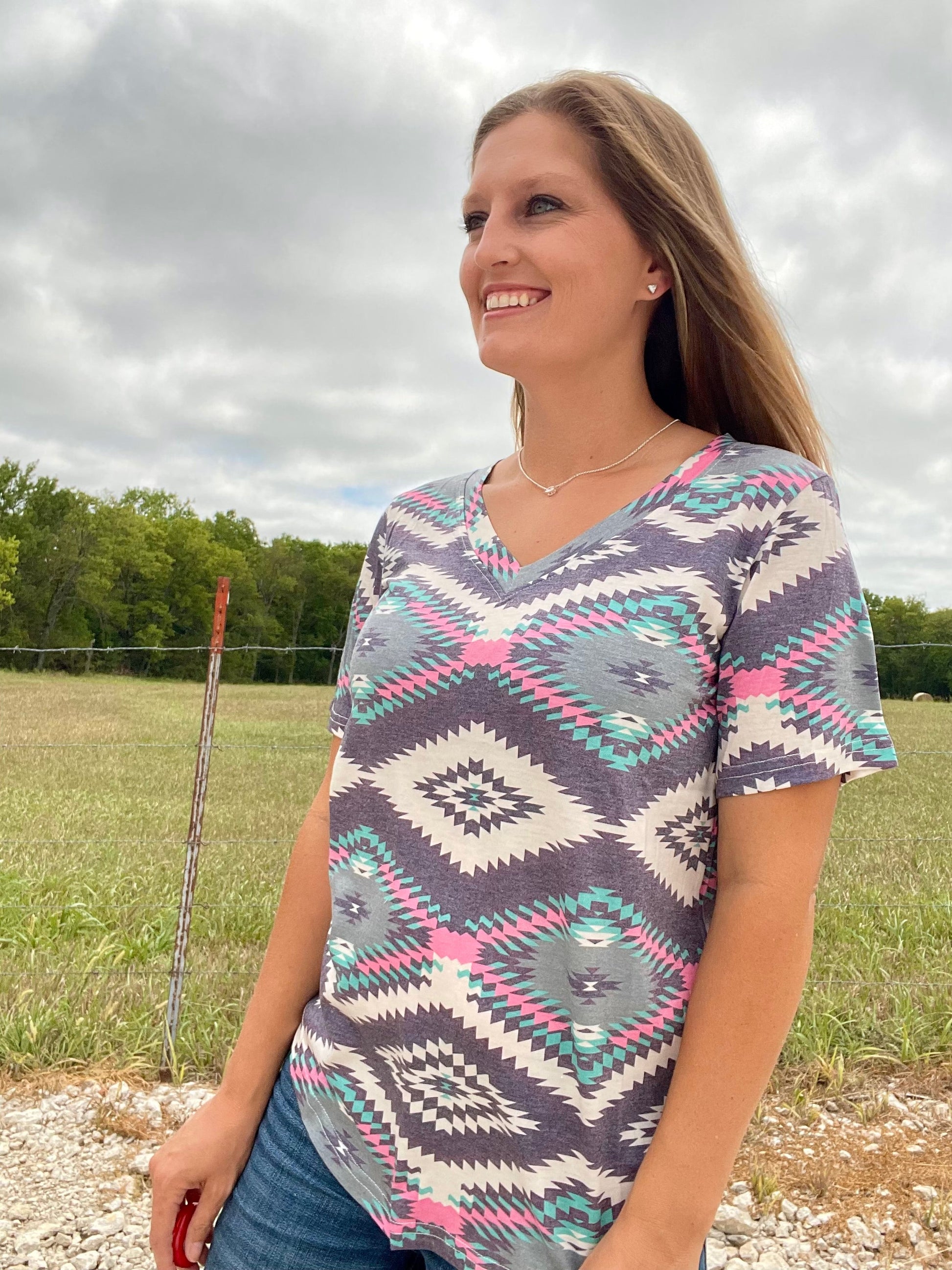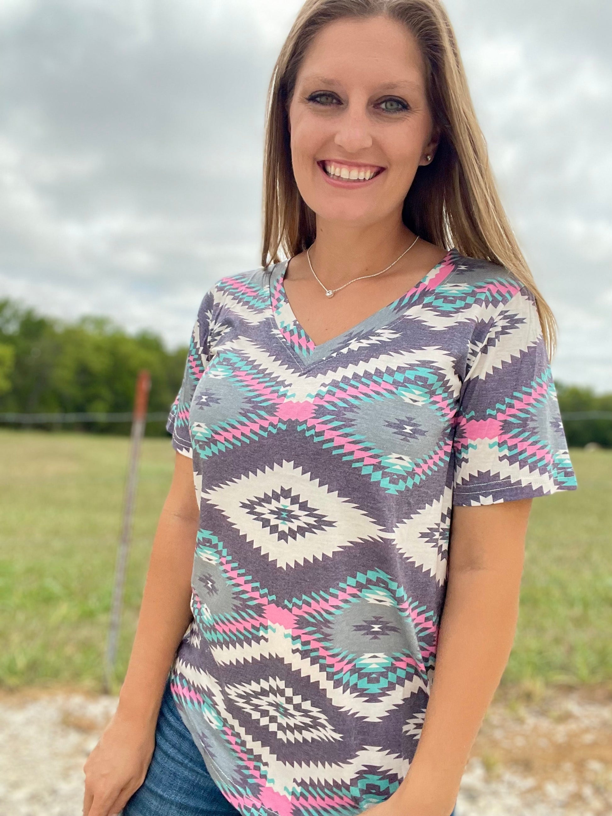 This Tucson Top will be your go-to for casual day-to-night style! Featuring a bold mix of cream, purple, pink, and turquoise in an eye-catching aztec pattern, this v-neck beauty is sure to spice up your wardrobe and have all eyes on you!