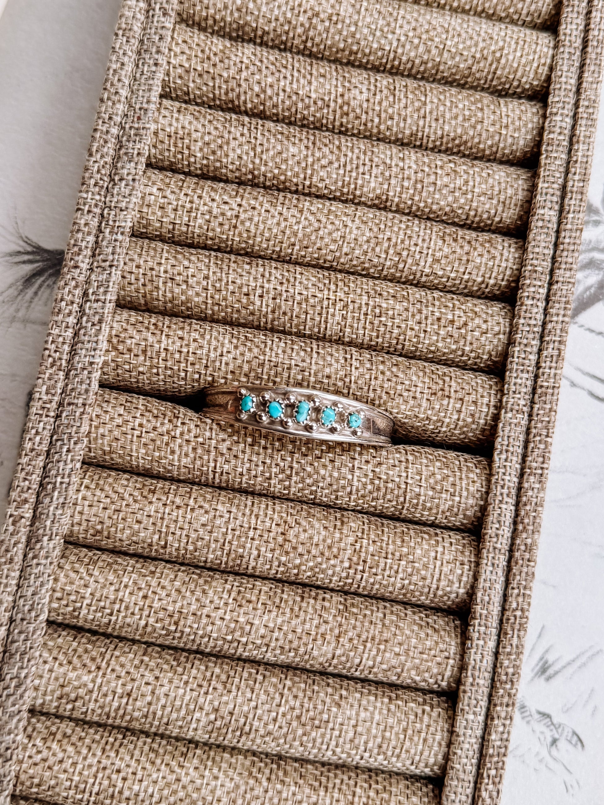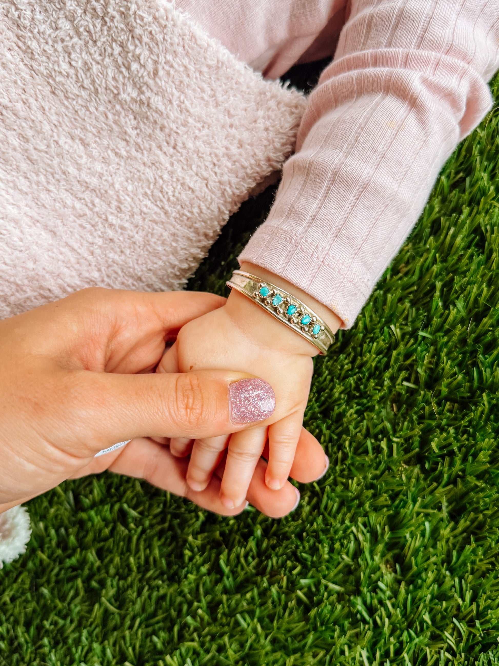 Sweet and delicate, this 5-stone turquoise baby bracelet features genuine turquoise set in sterling silver. Perfectly sized for little wrists, it’s a timeless, charming piece that adds a pop of natural color to any outfit.