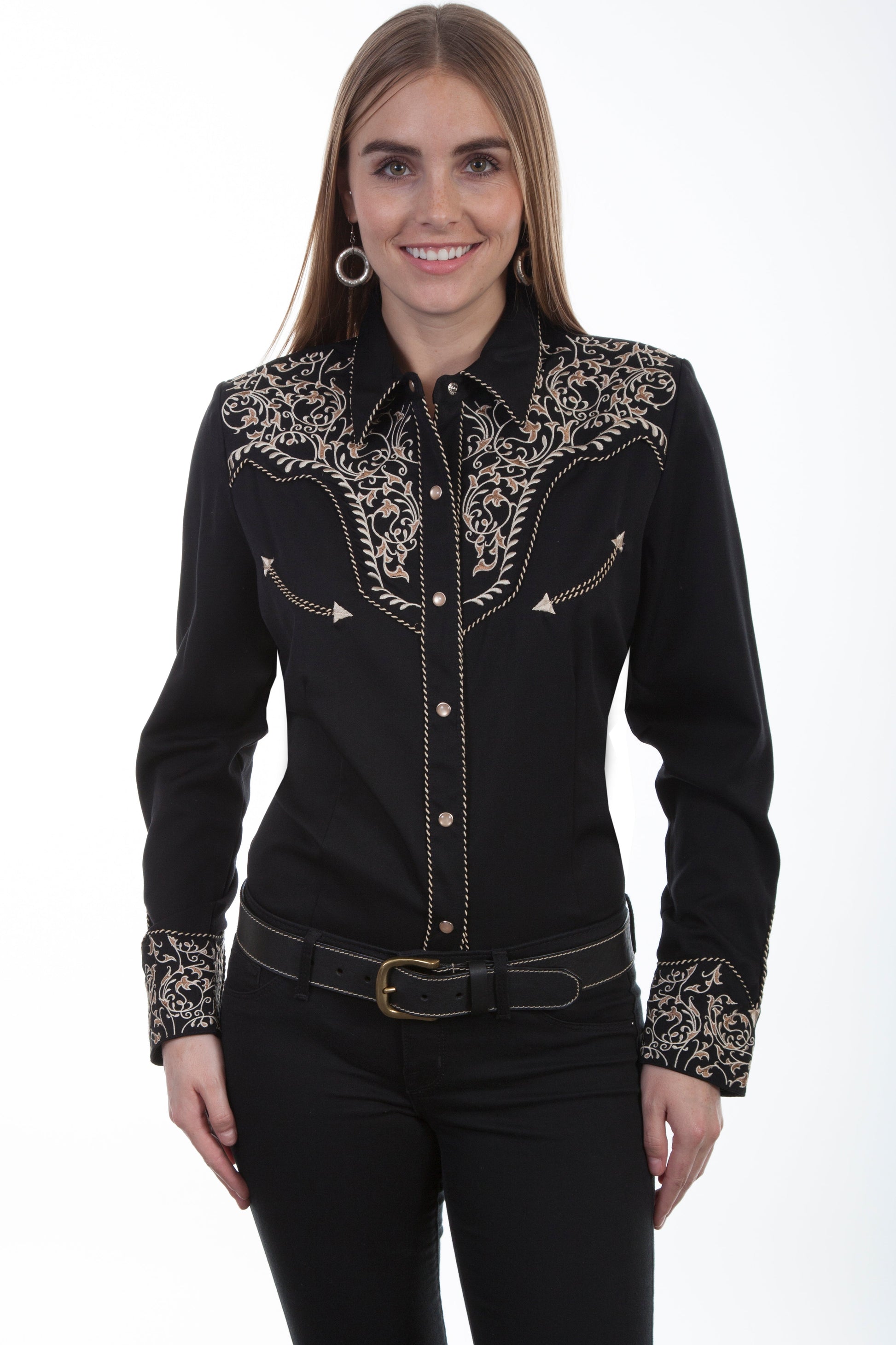 Poly/rayon blend blouse has a snap front and cuff closures. It features a two-tone scroll embroidery on yokes and cuffs. Candycane piping throughout. Machine wash cold and hang dry. Import.