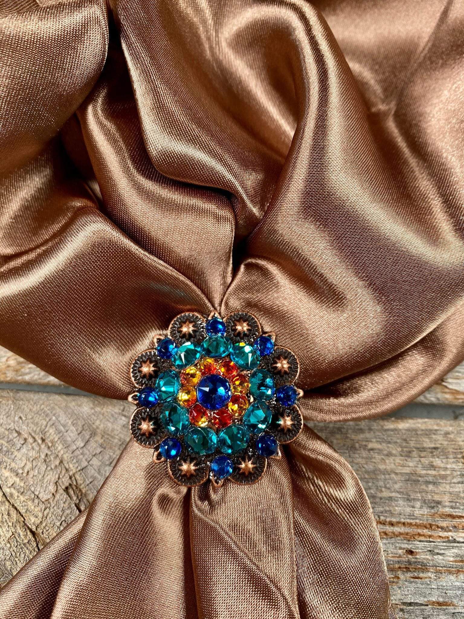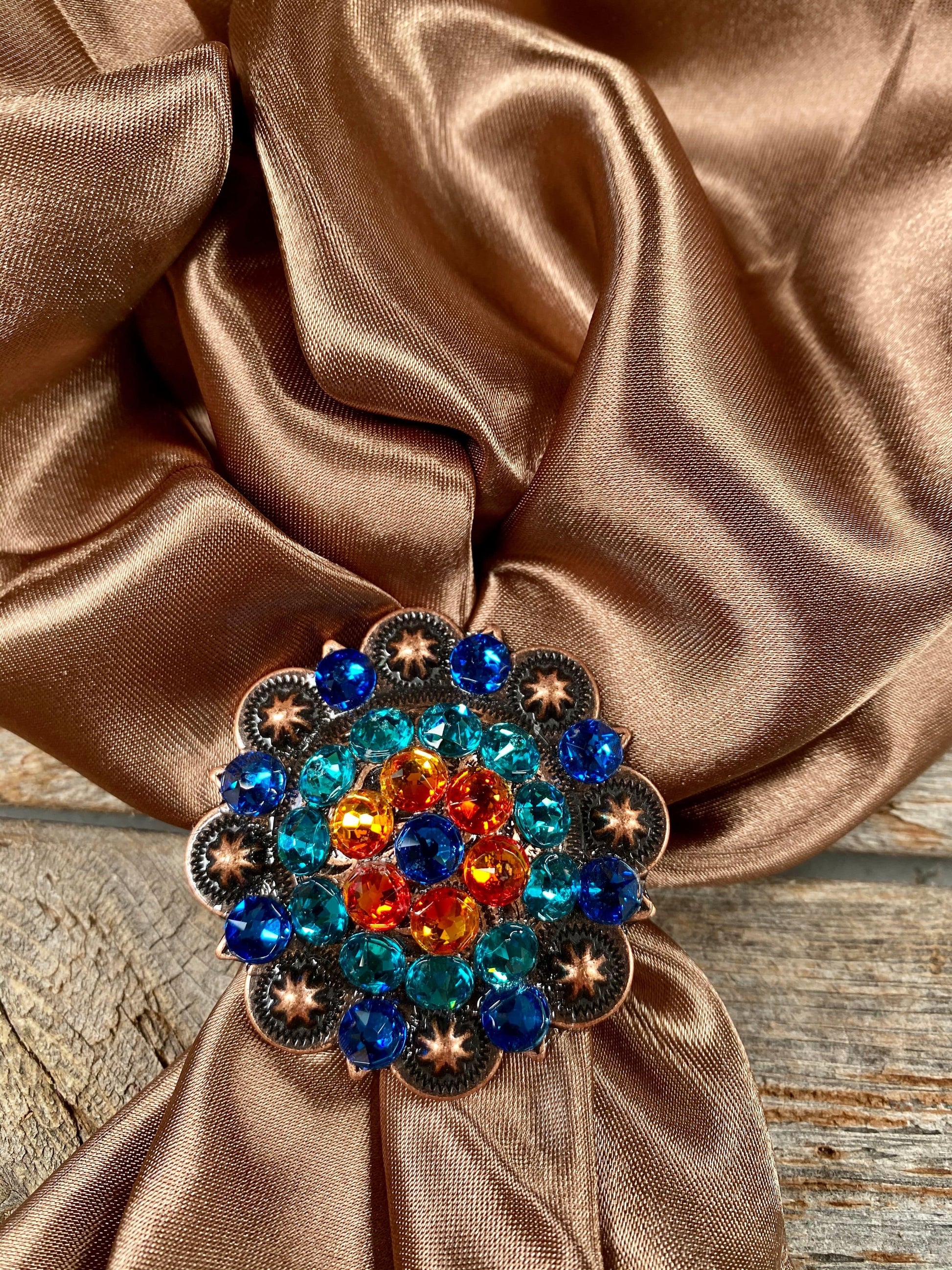 This Copper Capri, Fire Opal & Teal European crystal concho will match any wild rag. The slide adapter is easy to install and can be tied in a traditional or fancy knot. Wild rag not included.