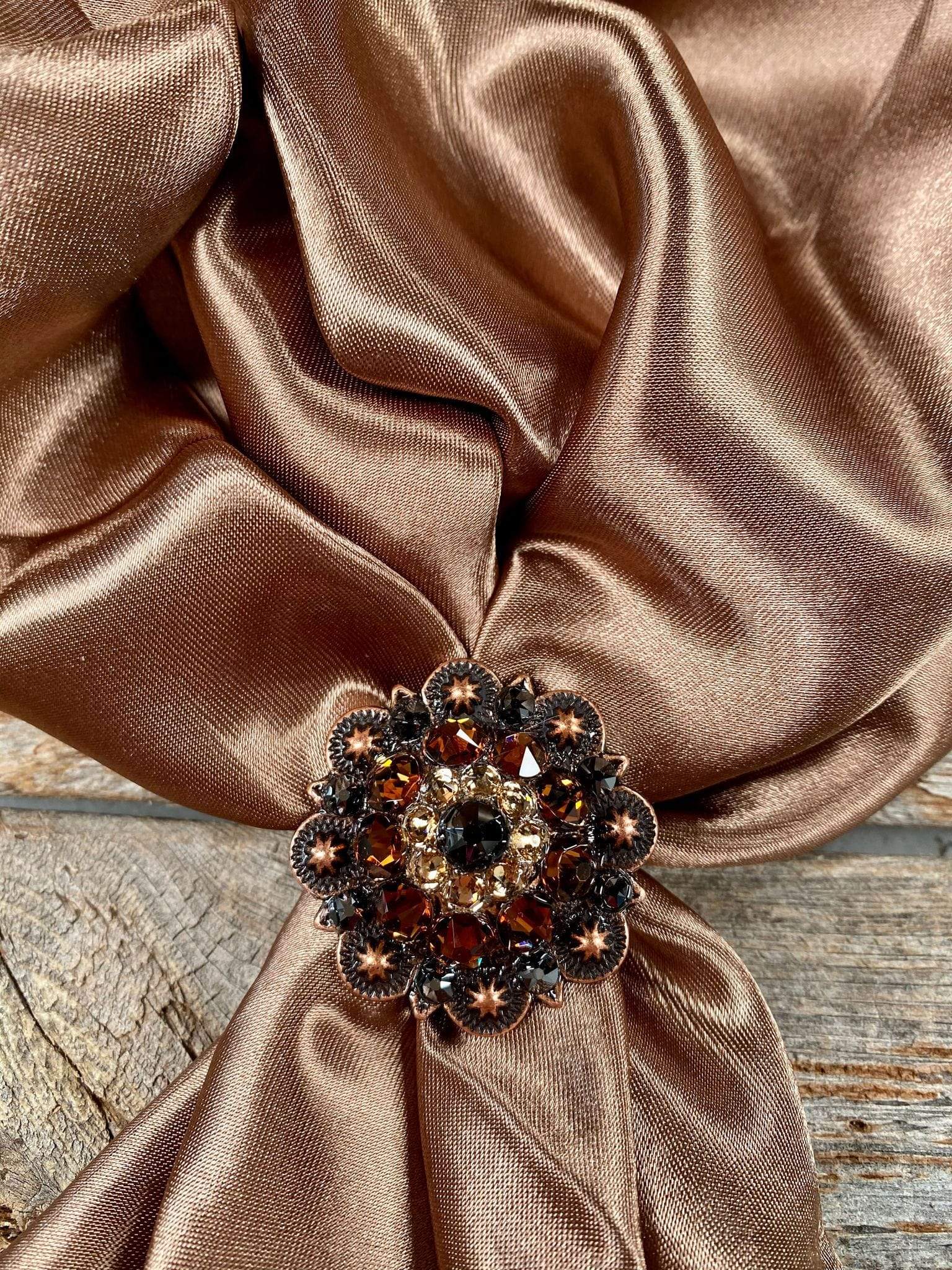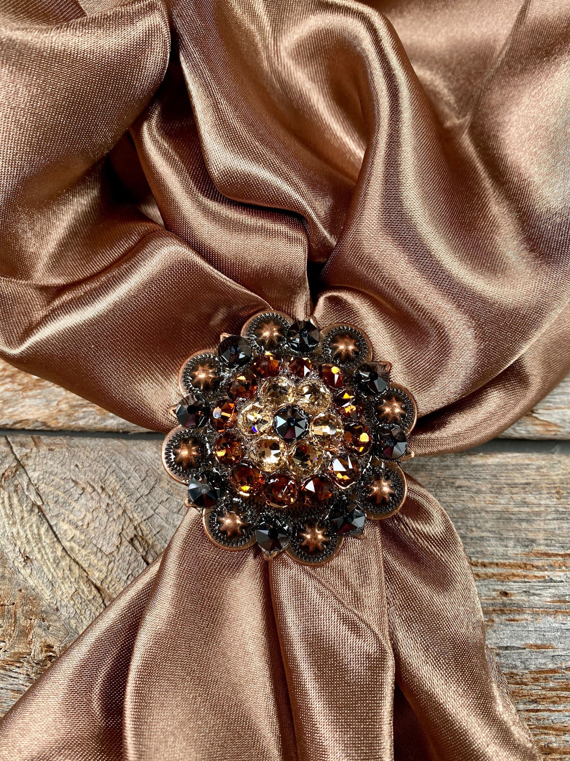 This Copper JET, CHAMPAGNE & TOPAZ European crystal concho will match any wild rag. The slide adapter is easy to install and can be tied in a traditional or fancy knot. Wild rag not included.
