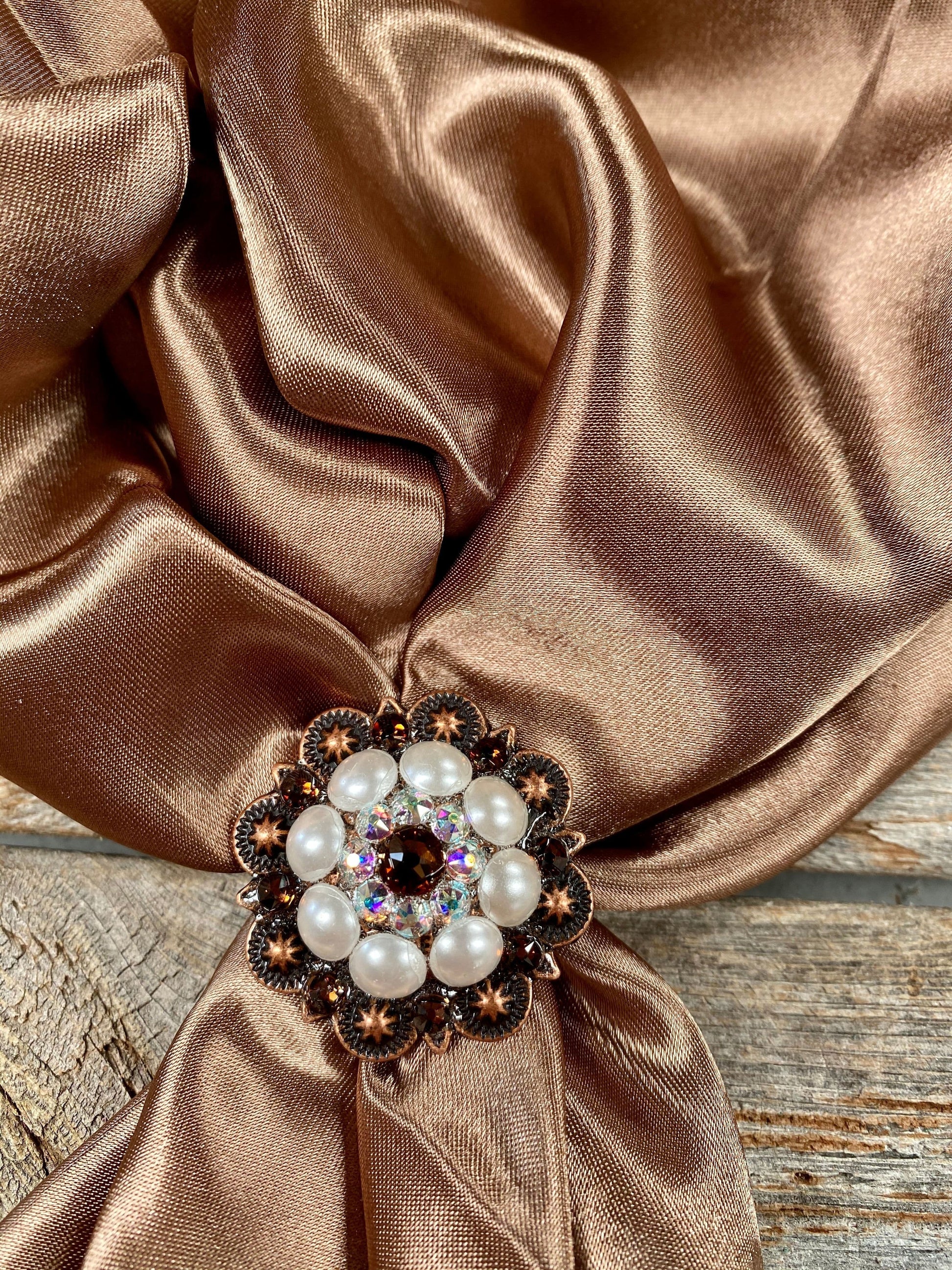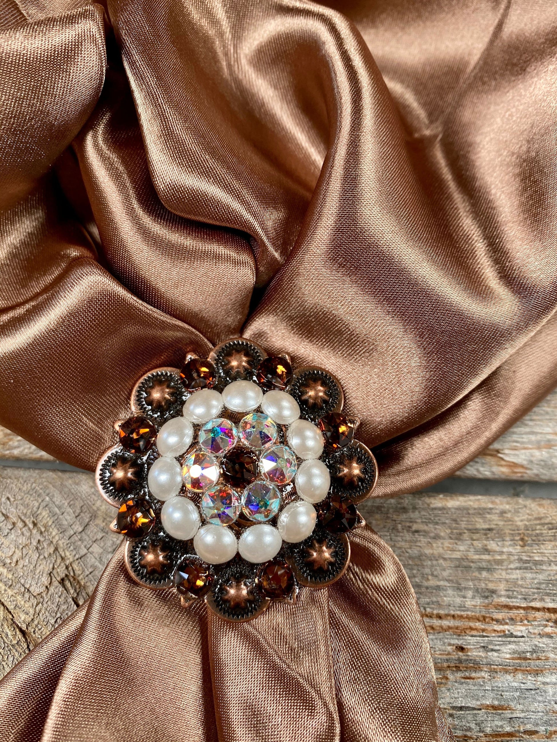 This Copper Topaz , AB & Pearl European crystal concho will match any wild rag. The slide adapter is easy to install and can be tied in a traditional or fancy knot. Wild rag not included.