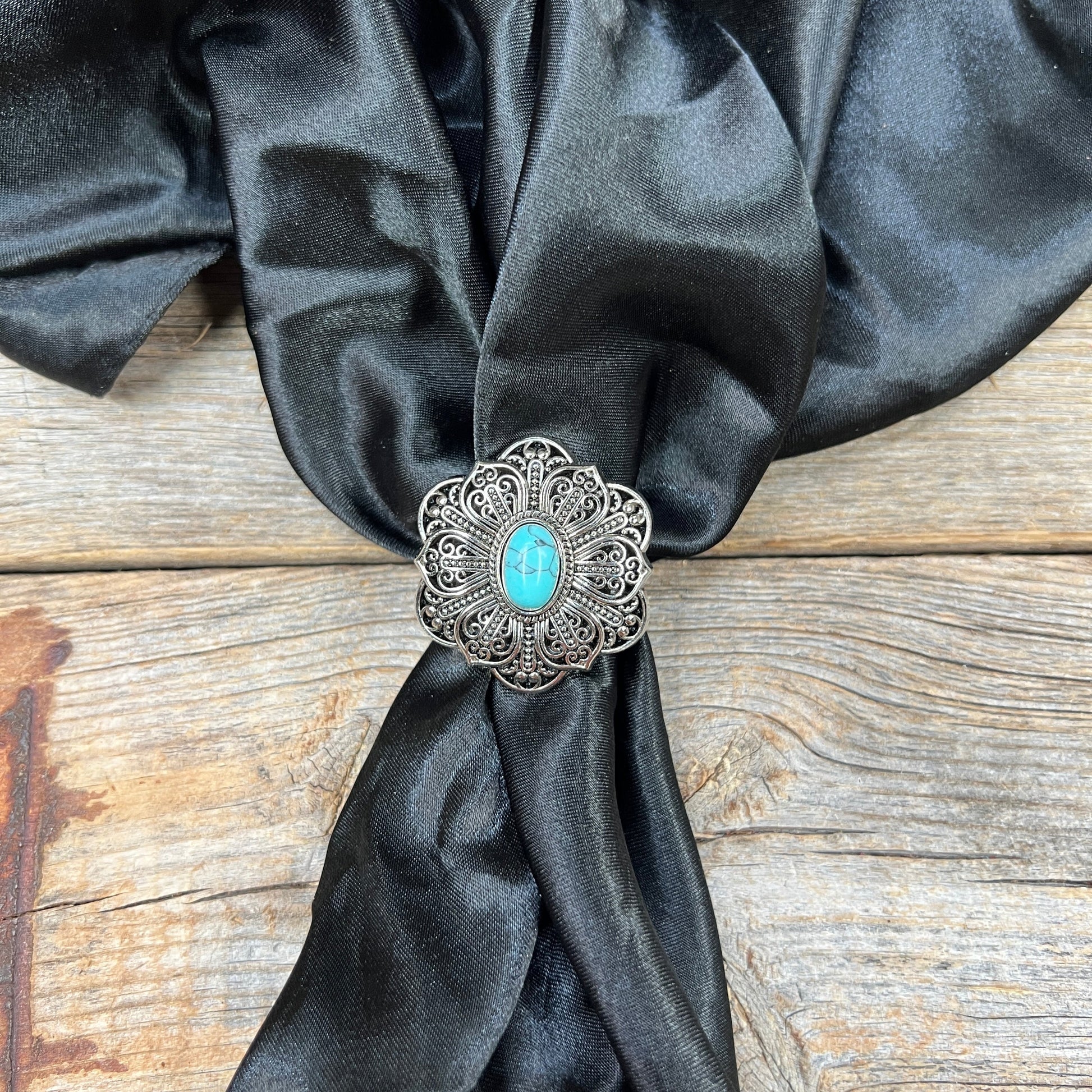 Antique Silver western concho with a dot design in a floral shape and a turquoise colored center stone western concho slide (W234).