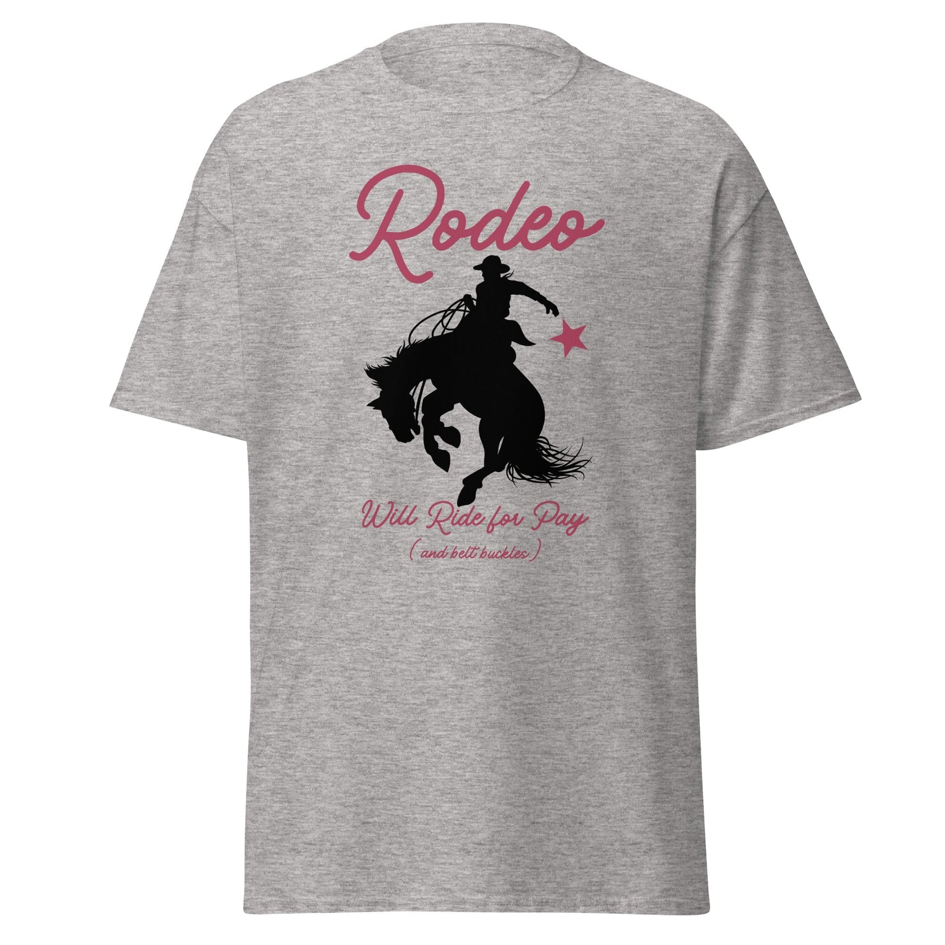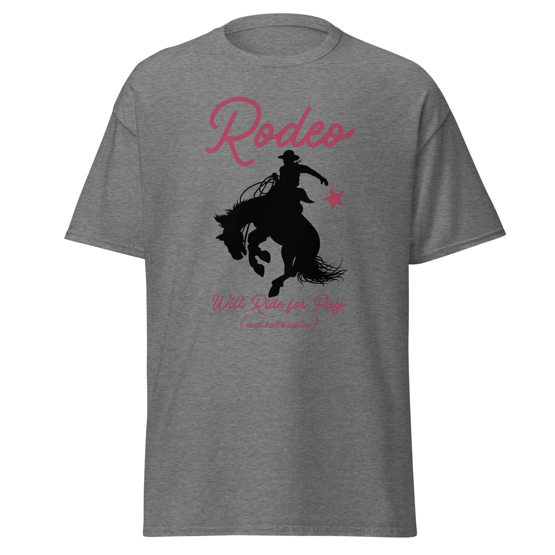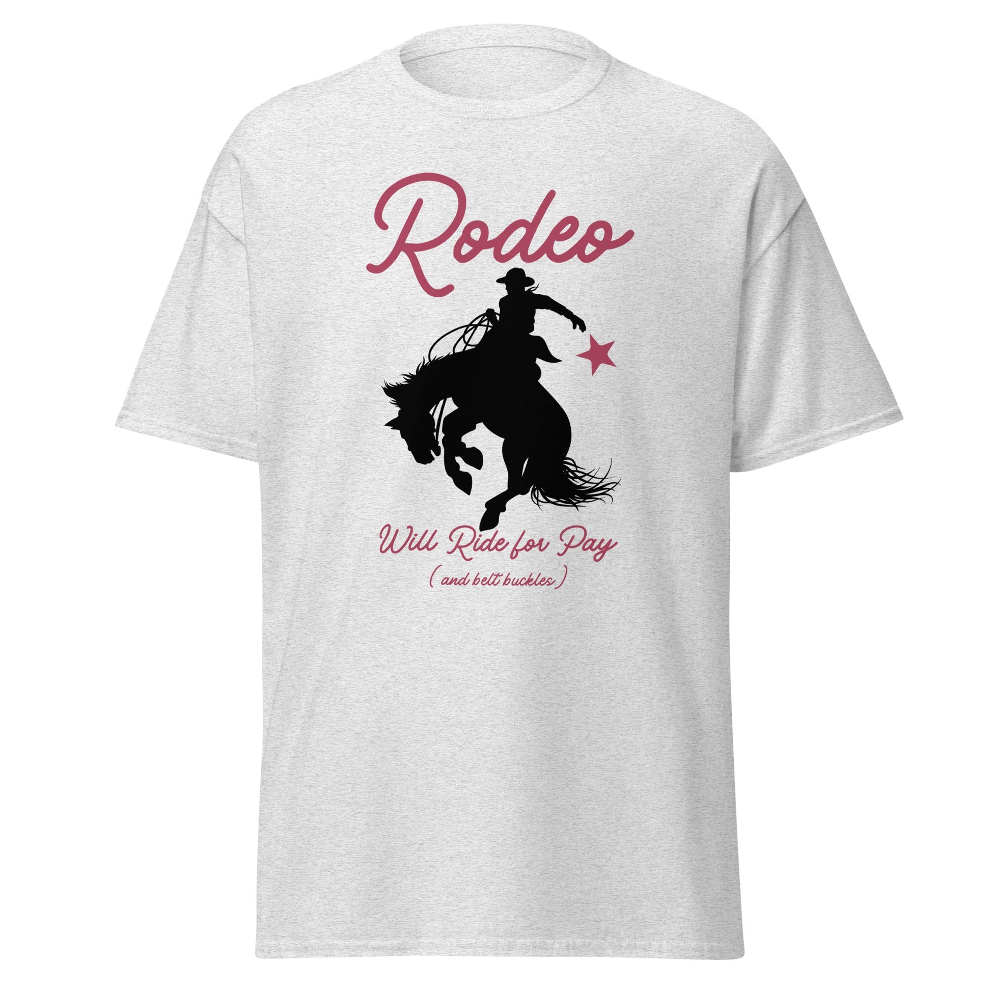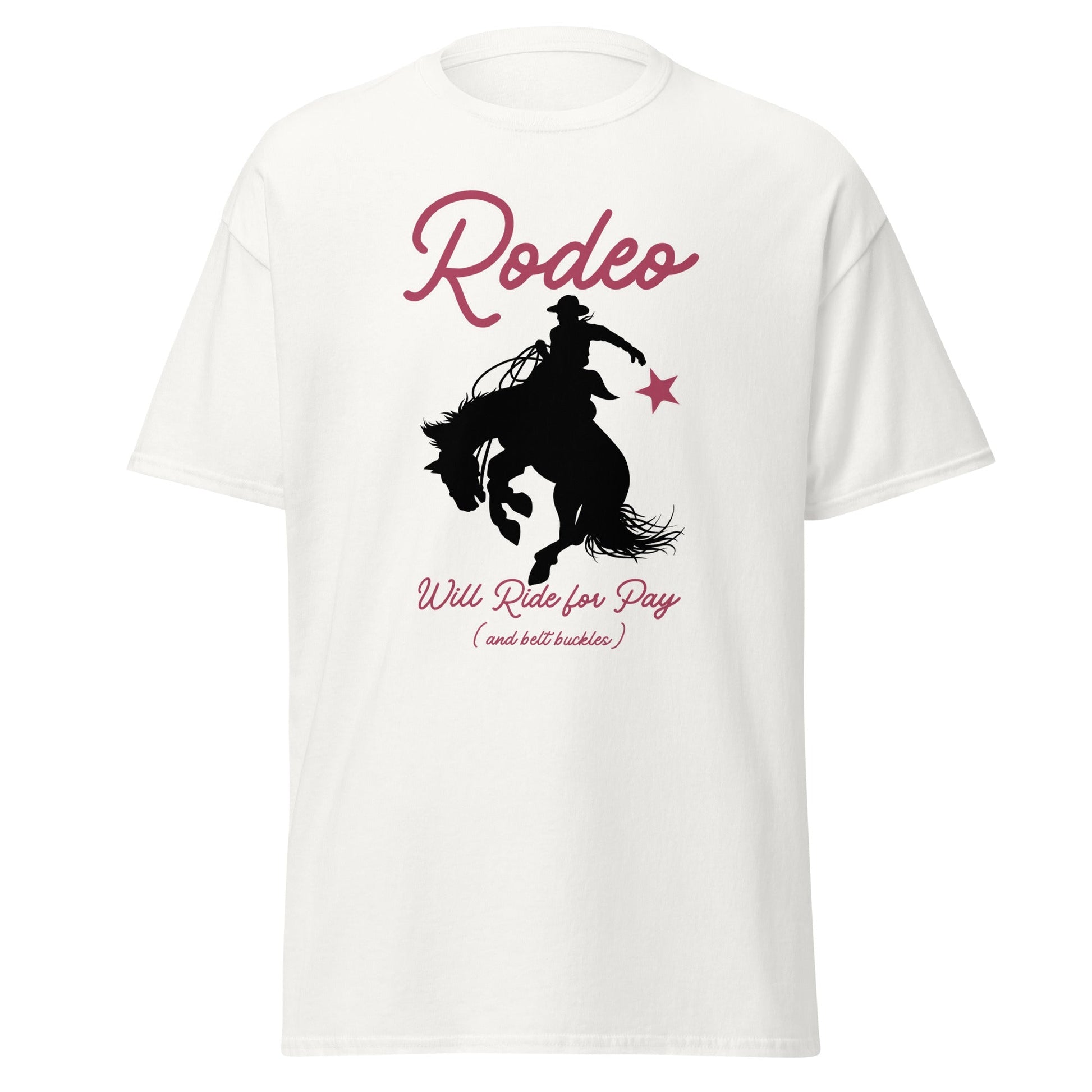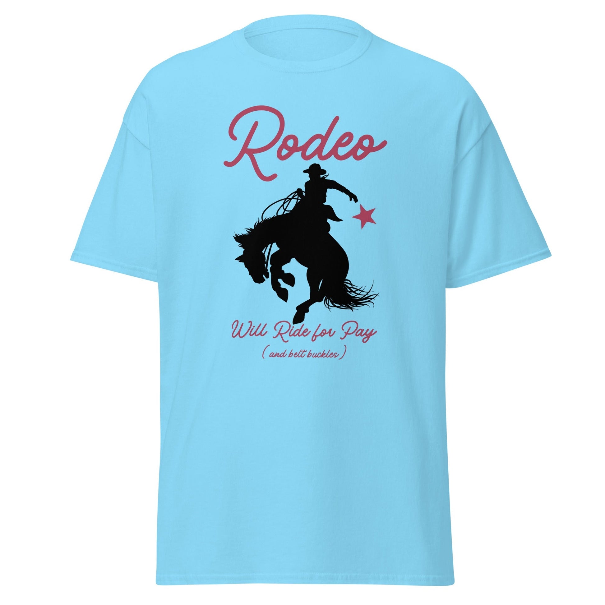 Show your passion for rodeo and bronc riding with the Will Ride For Pay Tee. This summer-ready top combines comfort and style, perfect for warm days at the arena or casual outings. Featuring a bold design inspired by classic belt buckles, it’s a statement piece that celebrates your love for the ride. Stay cool and confident while showcasing your rodeo spirit wherever you go.