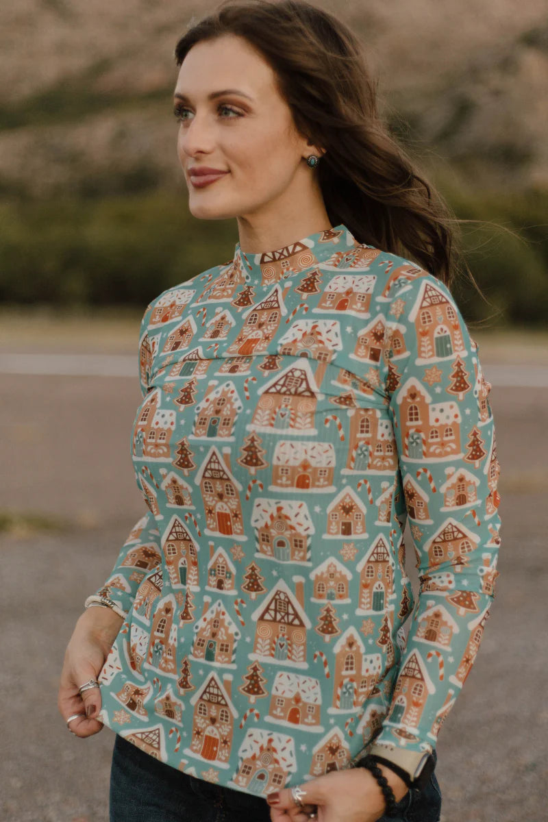 Celebrate the season in style with the Wrangler's Wonderland Mesh Top. Featuring playful gingerbread house designs, this breathable mesh top combines festive charm with comfortable wear. Perfect for layering or standing out at any holiday gathering, it adds a unique touch to your winter wardrobe. Embrace warmth and whimsy effortlessly with this eye-catching piece.