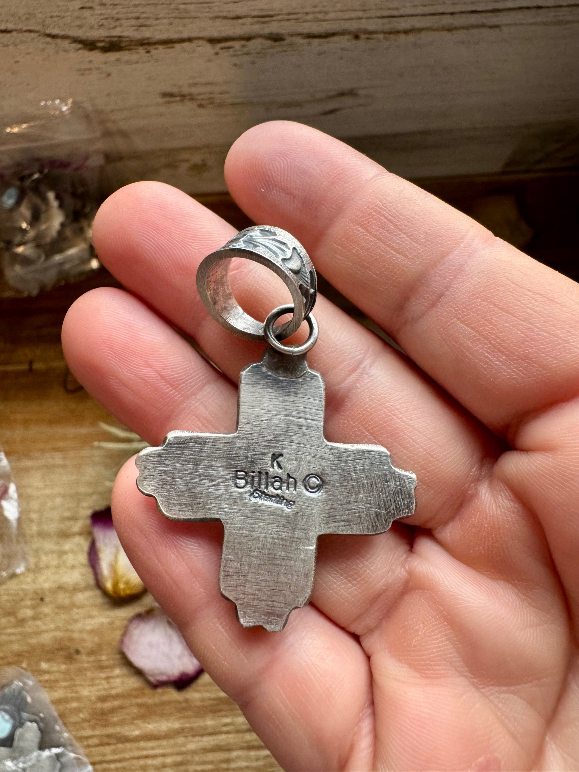 Handmade in the USA by Native silversmith K. Billah, this sterling silver pendant features the traditional Zia sun symbol with a Sonoran Gold turquoise stone set at the center. Stamped for authenticity, it blends powerful cultural symbolism with natural turquoise beauty. The bail fits up to 8mm pearls, making it perfect for pairing with a sterling silver pearl strand or layering with other Southwestern jewelry.